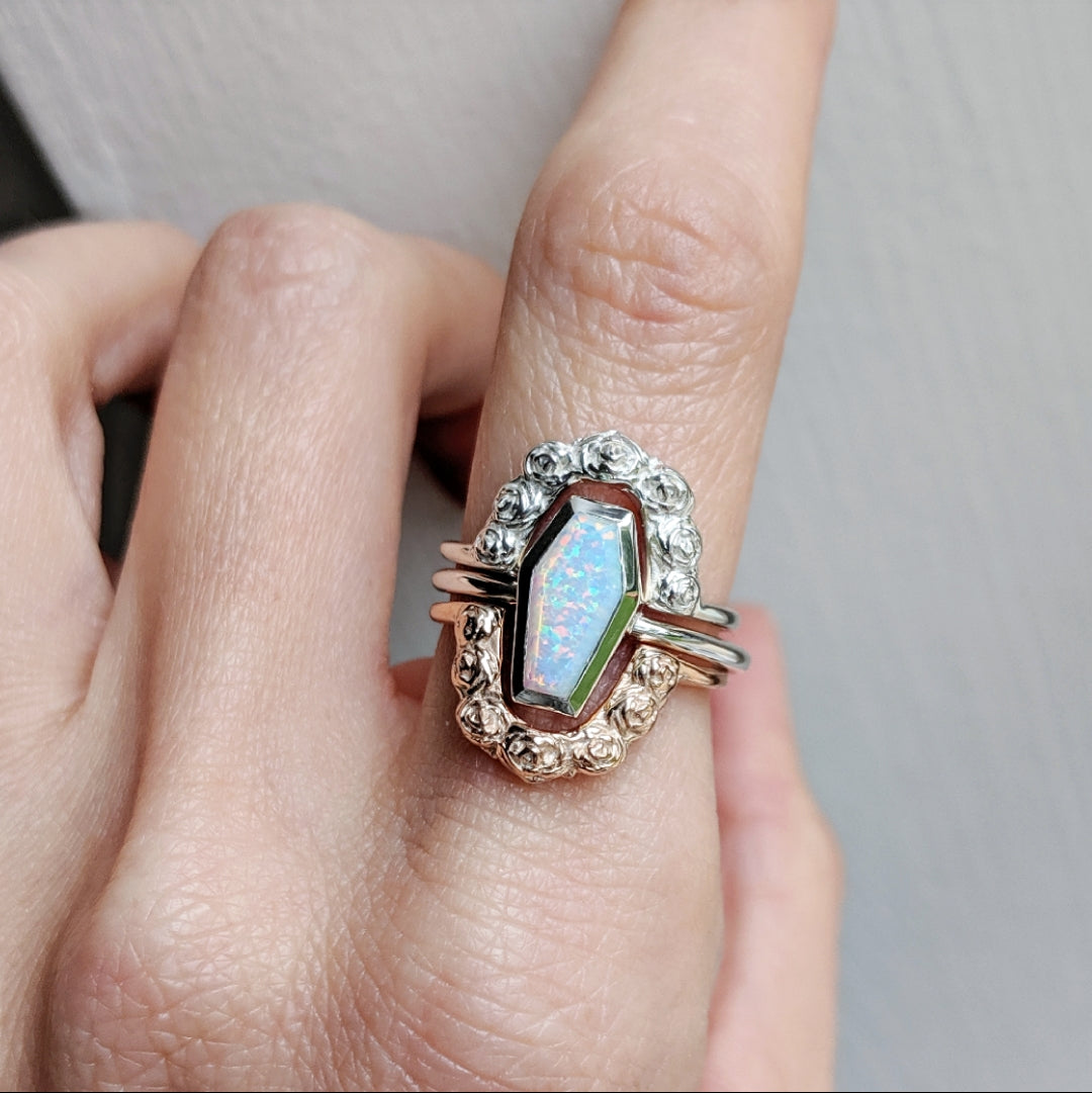 Hand cast cabbage rose ring that fits perfectly atop or below our Coffin Rings or looks beautiful on it's own.