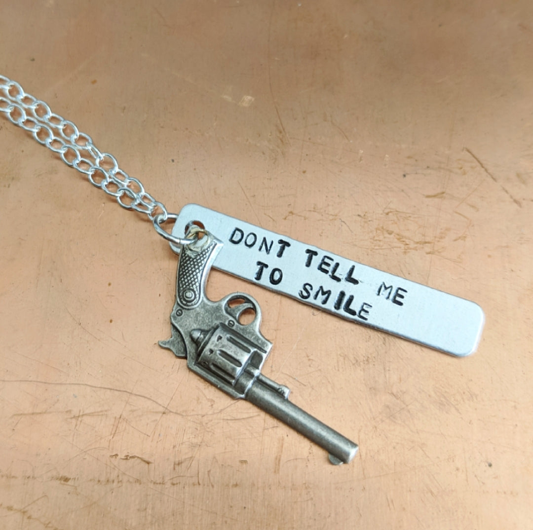 hand stamped aluminum pendant and a vintage brass pistol charm hanging from a sterling silver chain.