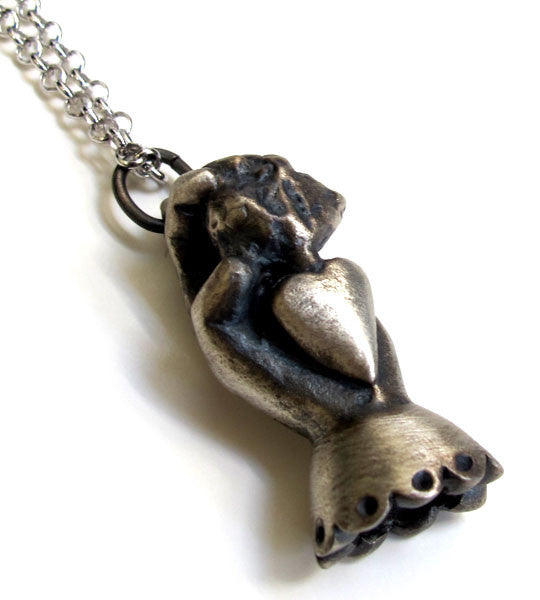 Hand carved flaming heart in hand pendant cast in sterling silver with an antiqued finish. This pendant has a very nice weight to it.