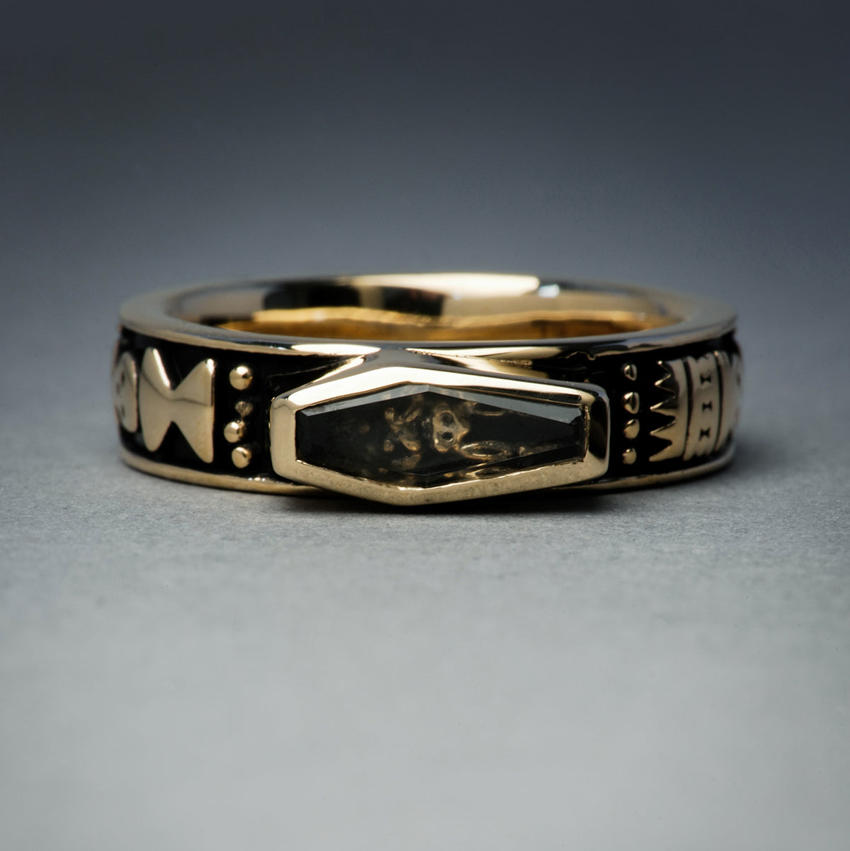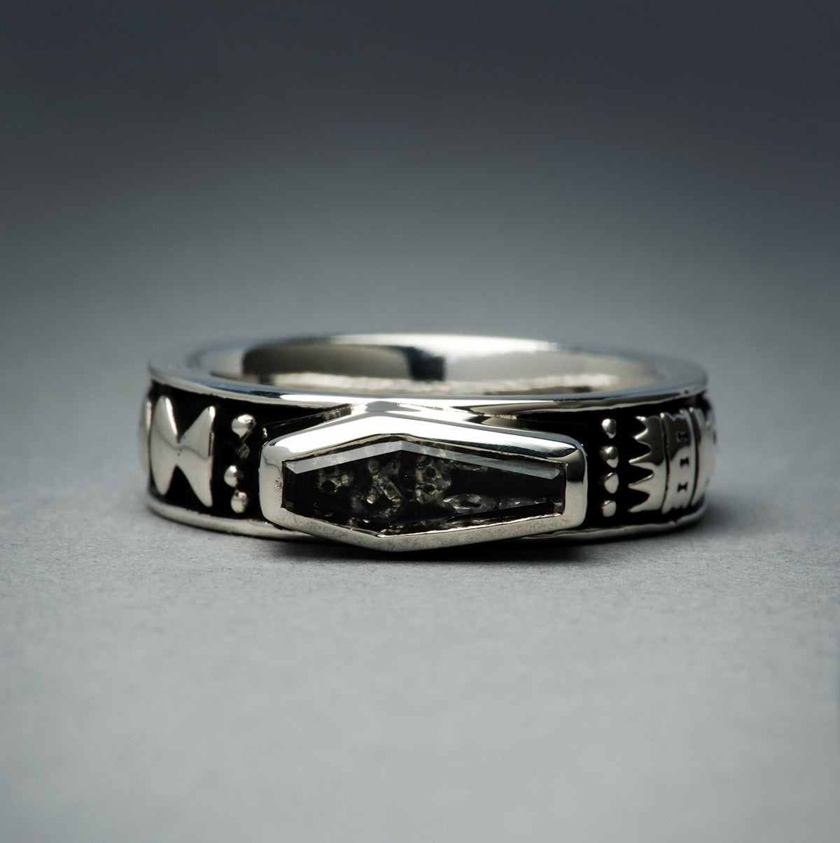 Extremely detailed band featuring two full skeletons, with a crown atop one's head signifying that "death is the ruler of all." Atop the other skeleton's head there is an hourglass, representing the fact that time is passing. All details on the ring are reserved on black enamel that encircles the outer ring loops. The focal point of this ring is the skeleton carved out of sterling silver that in encapsulated by a pristine faceted casket shaped crystal.