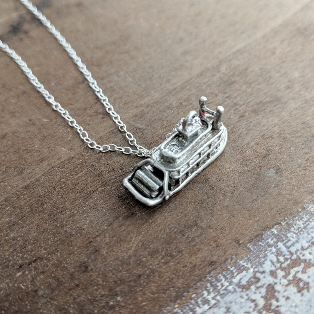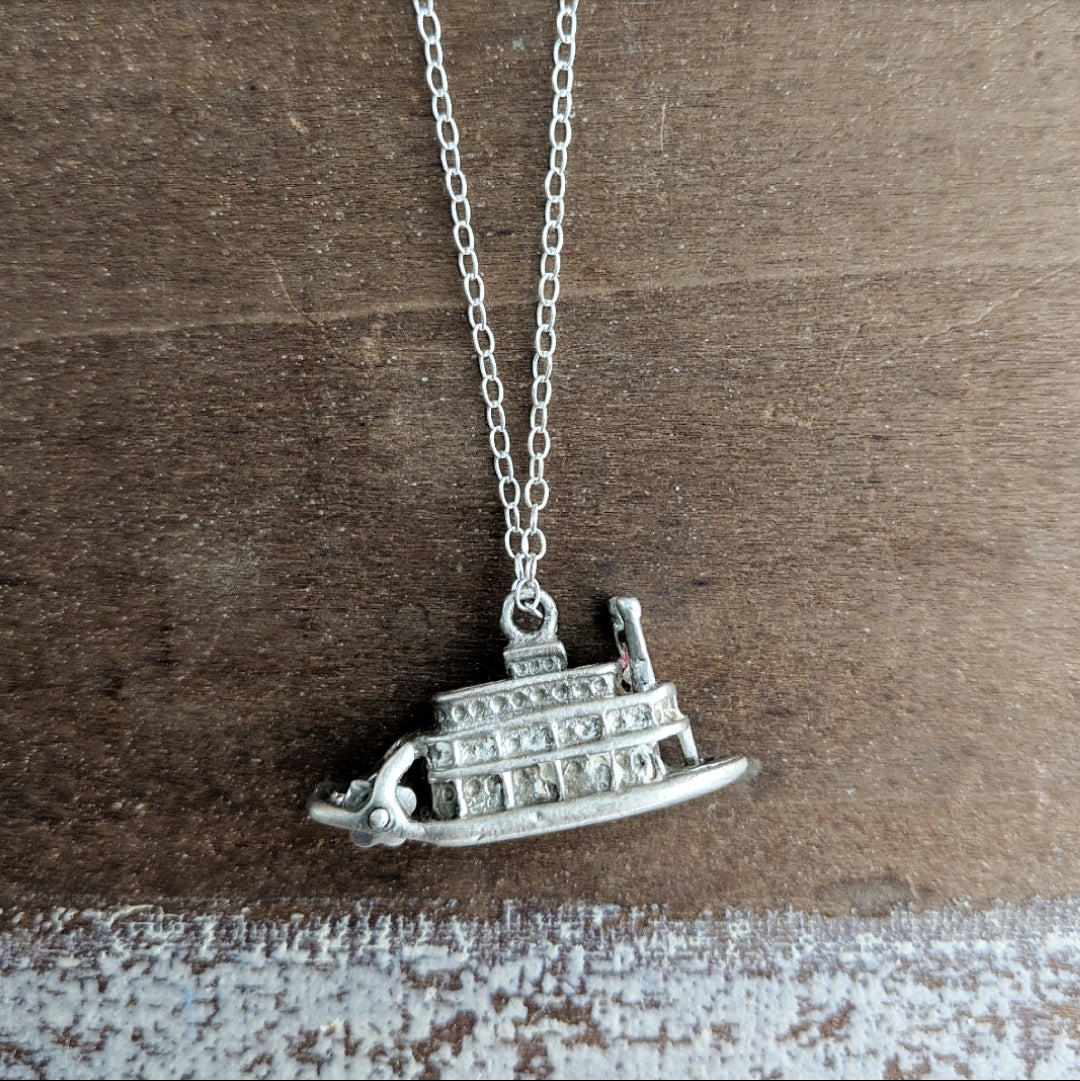 Antique sterling silver moving riverboat charm hanging from a sterling silver chain.