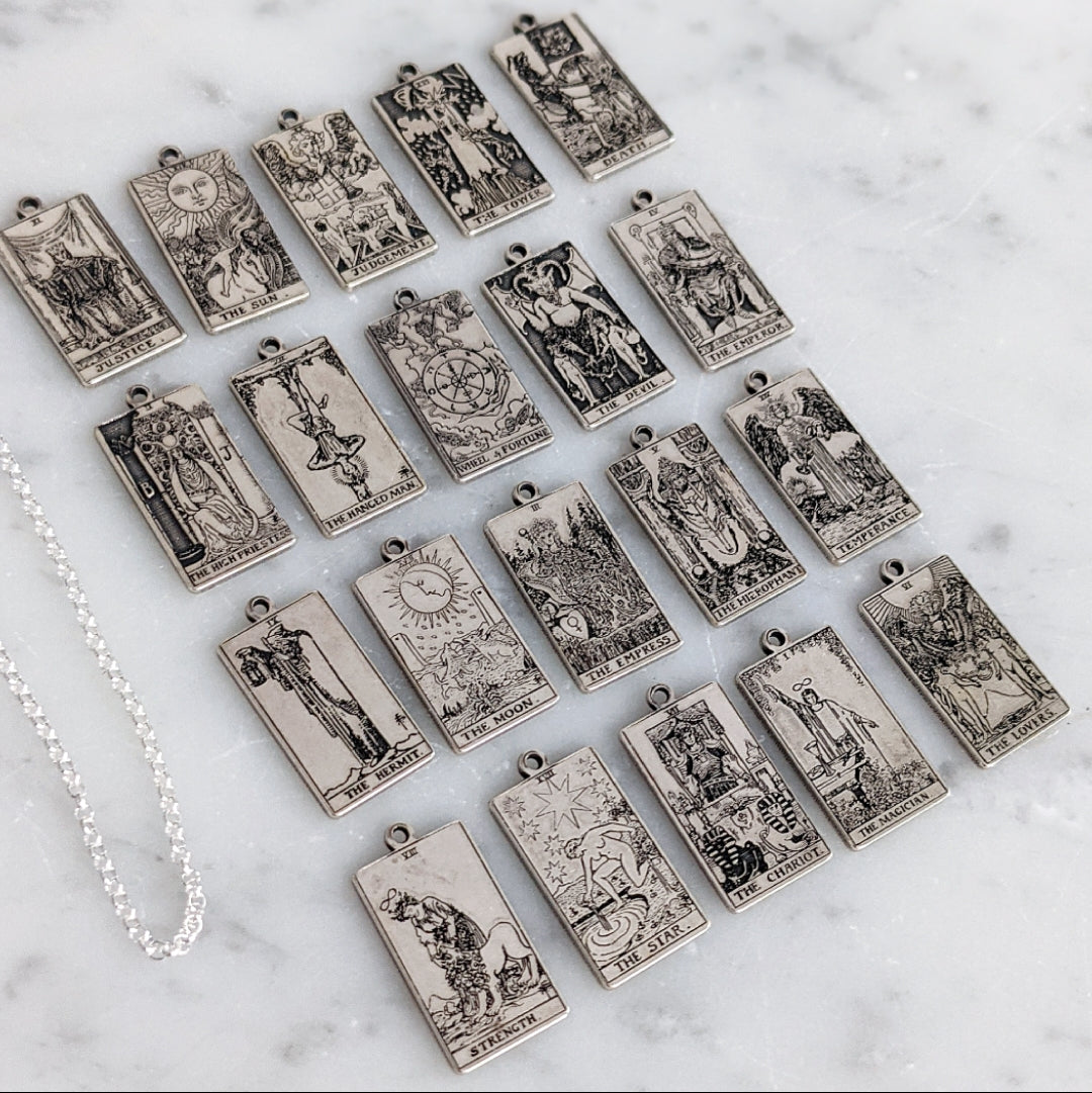 Your choice of 1 18mm tall sterling silver highly detailed tarot card charm hanging from a sterling silver chain.