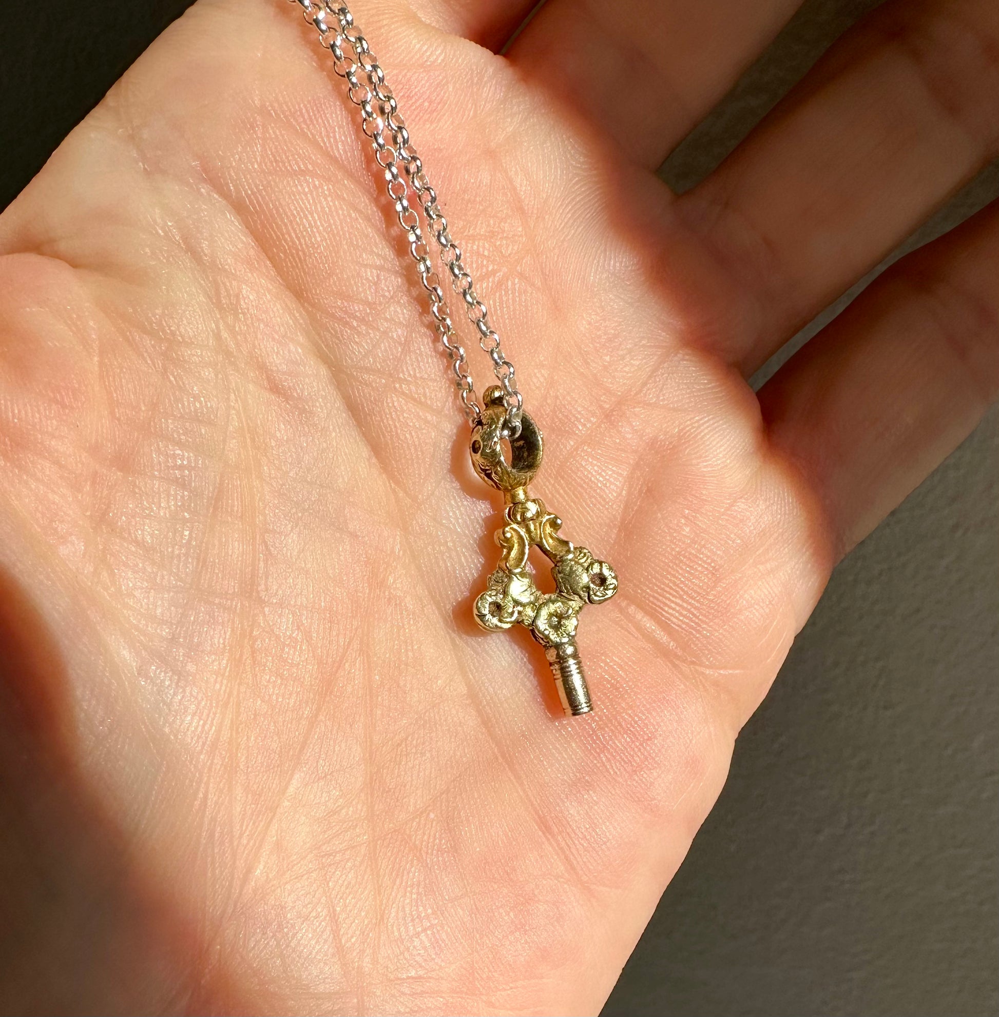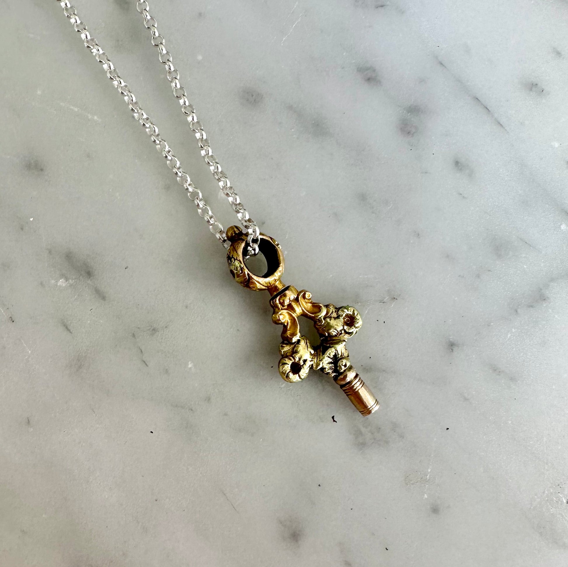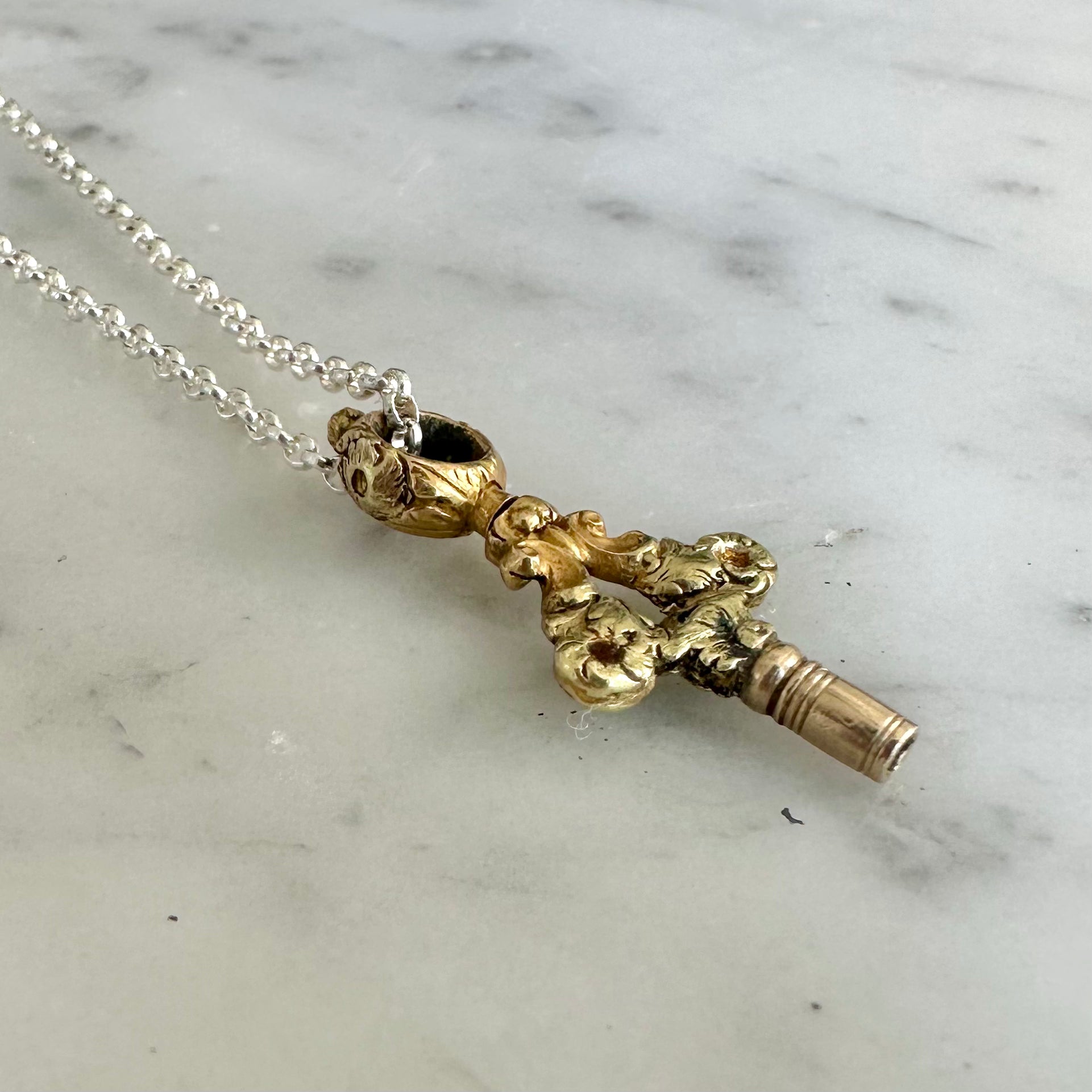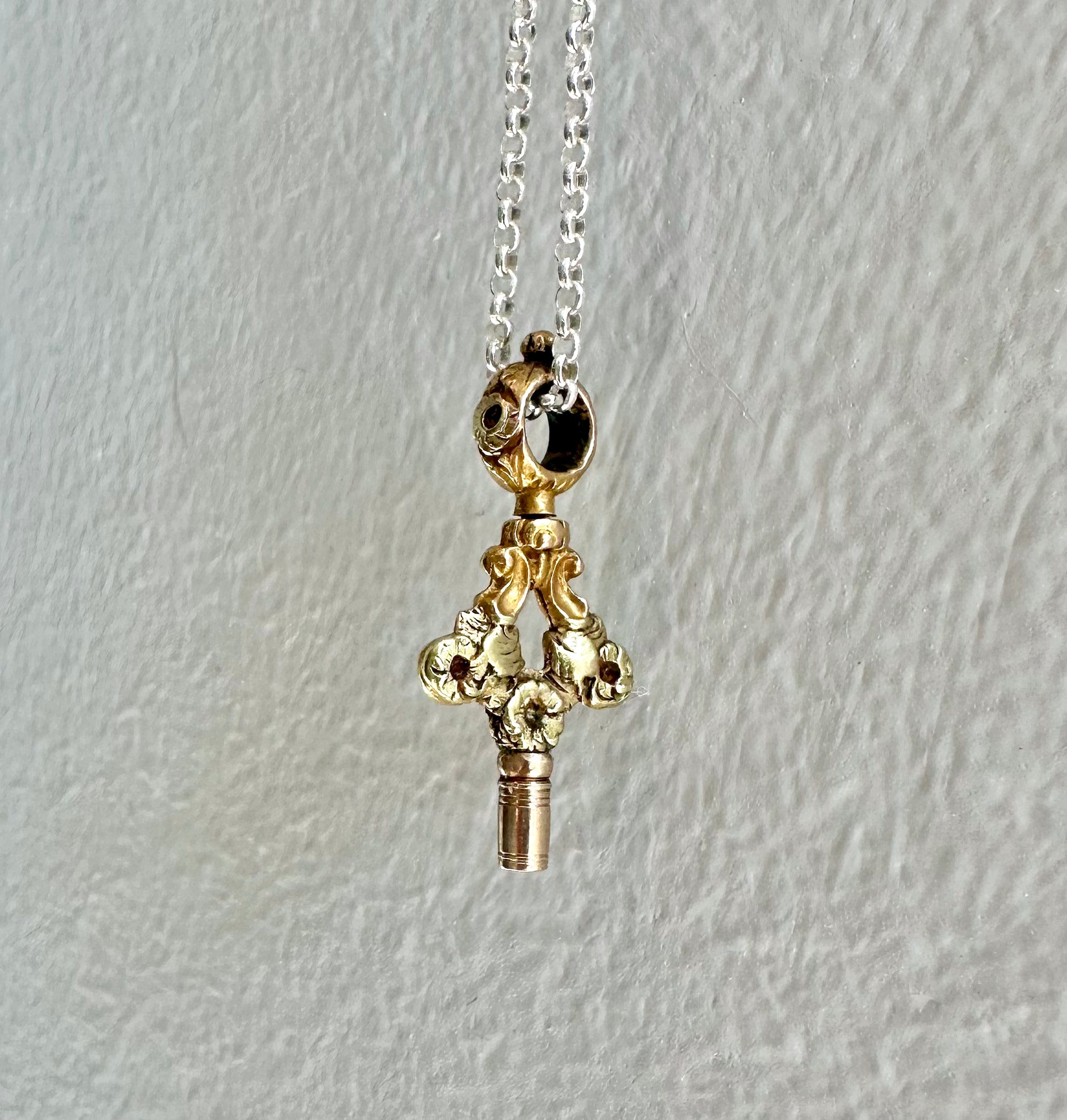 Gorgeous 18ct gold Georgian pocket watch winder with beautiful floral and filigree detail hanging from a sterling silver chain.