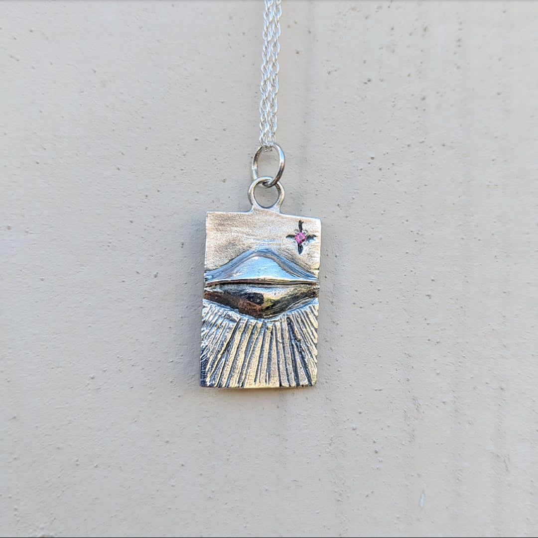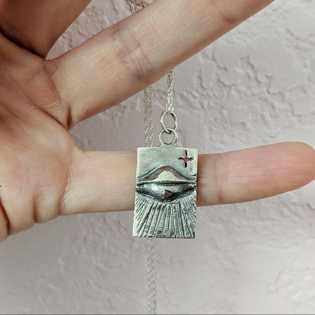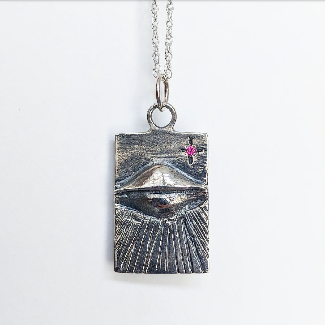 3/4" tall sterling silver UFO abduction charm adorned with a pink tourmaline "star."