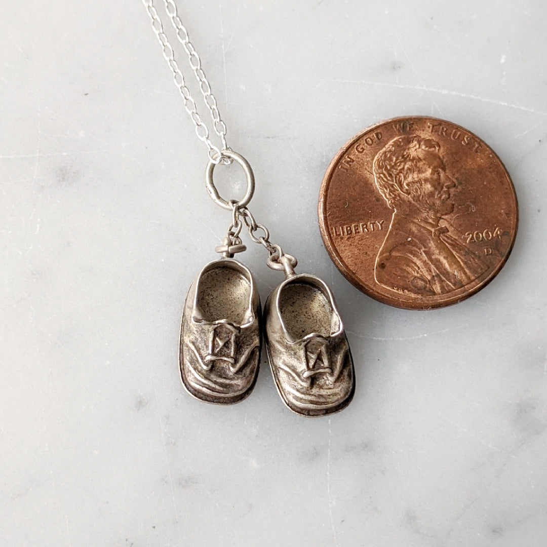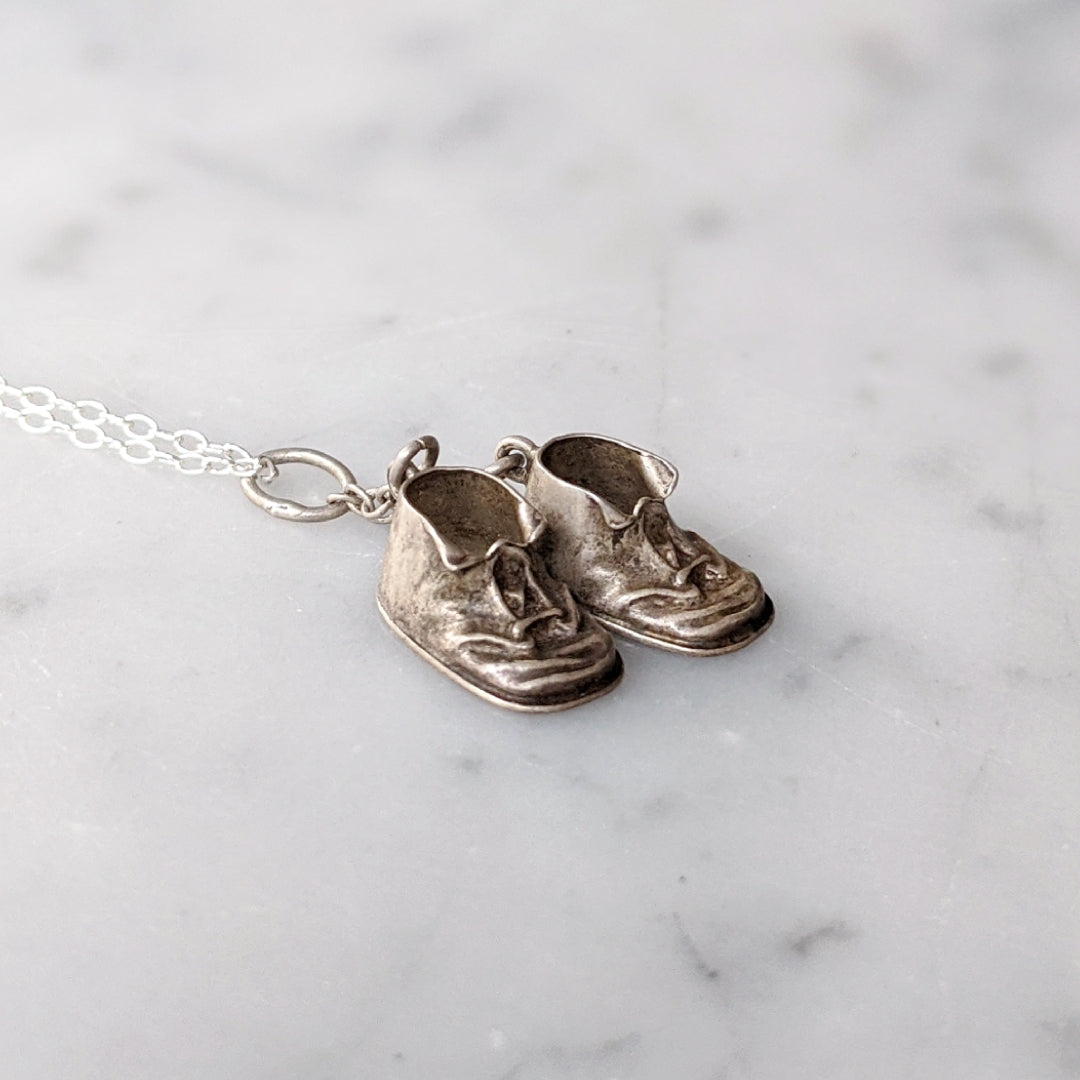 Antique sterling silver baby booties hanging from a sterling silver chain.