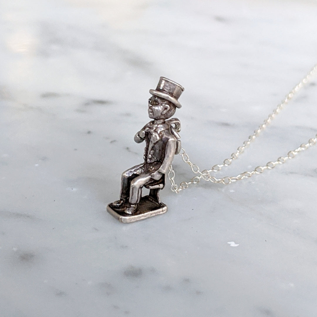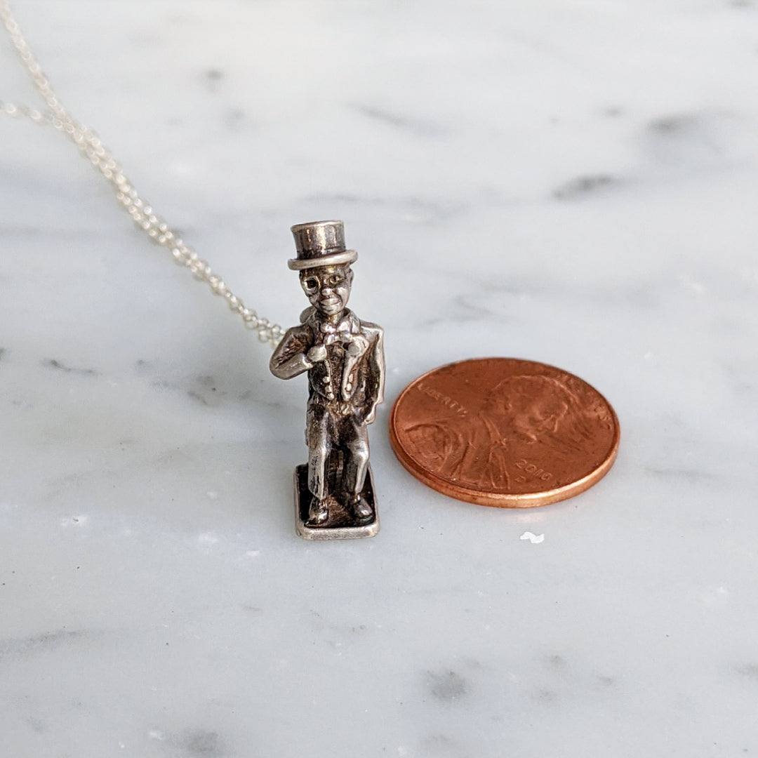 Antique sterling silver highly detailed ventriloquist dummy that's head bobbles back and forth hanging from a sterling silver chain.