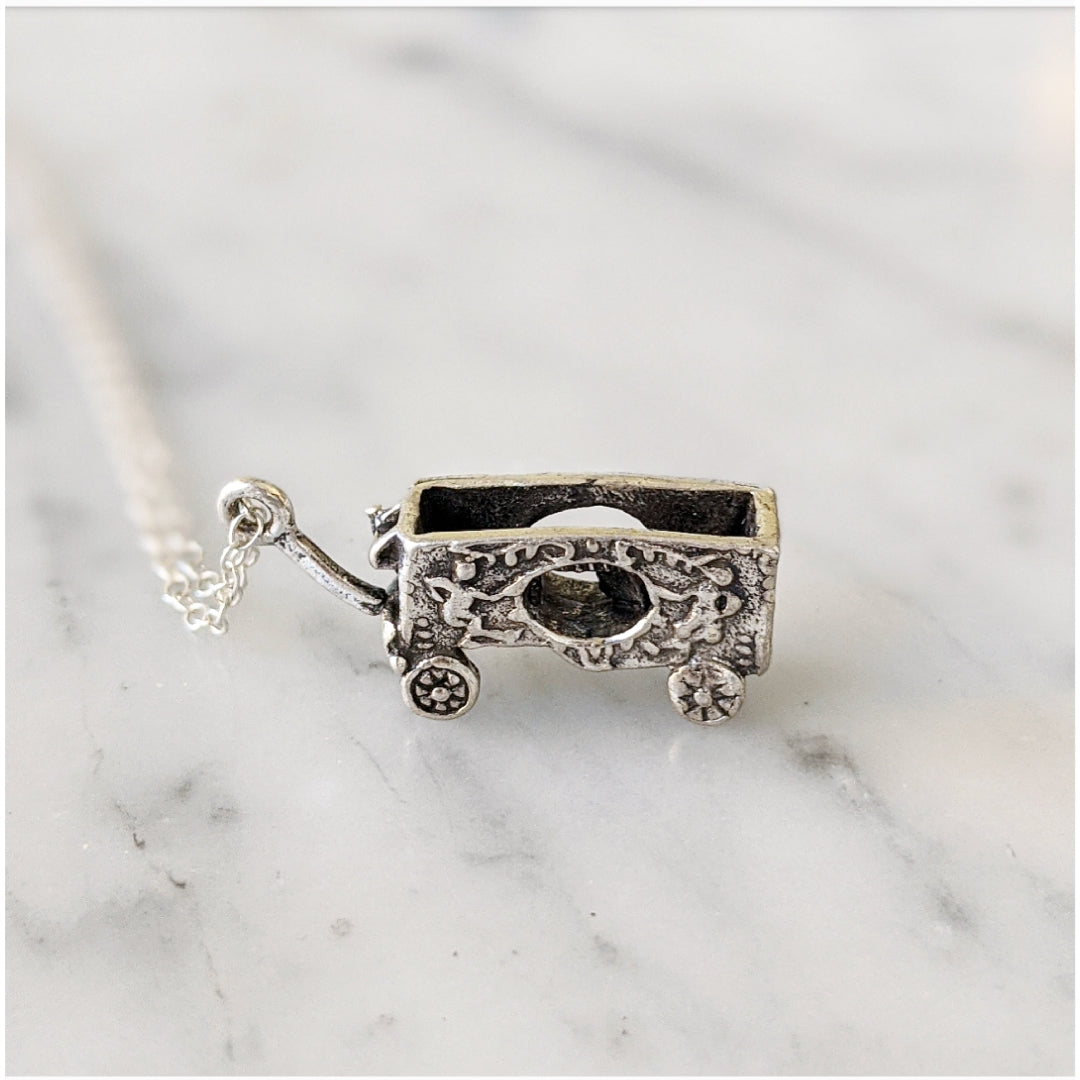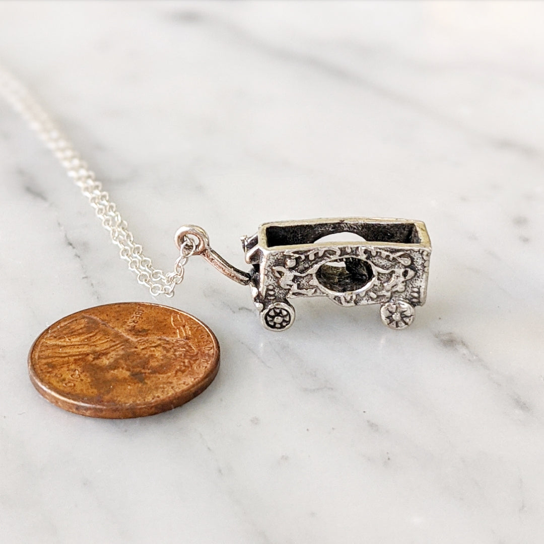 Antique Sterling silver circus calliope music wagon charm hanging from a sterling silver chain.