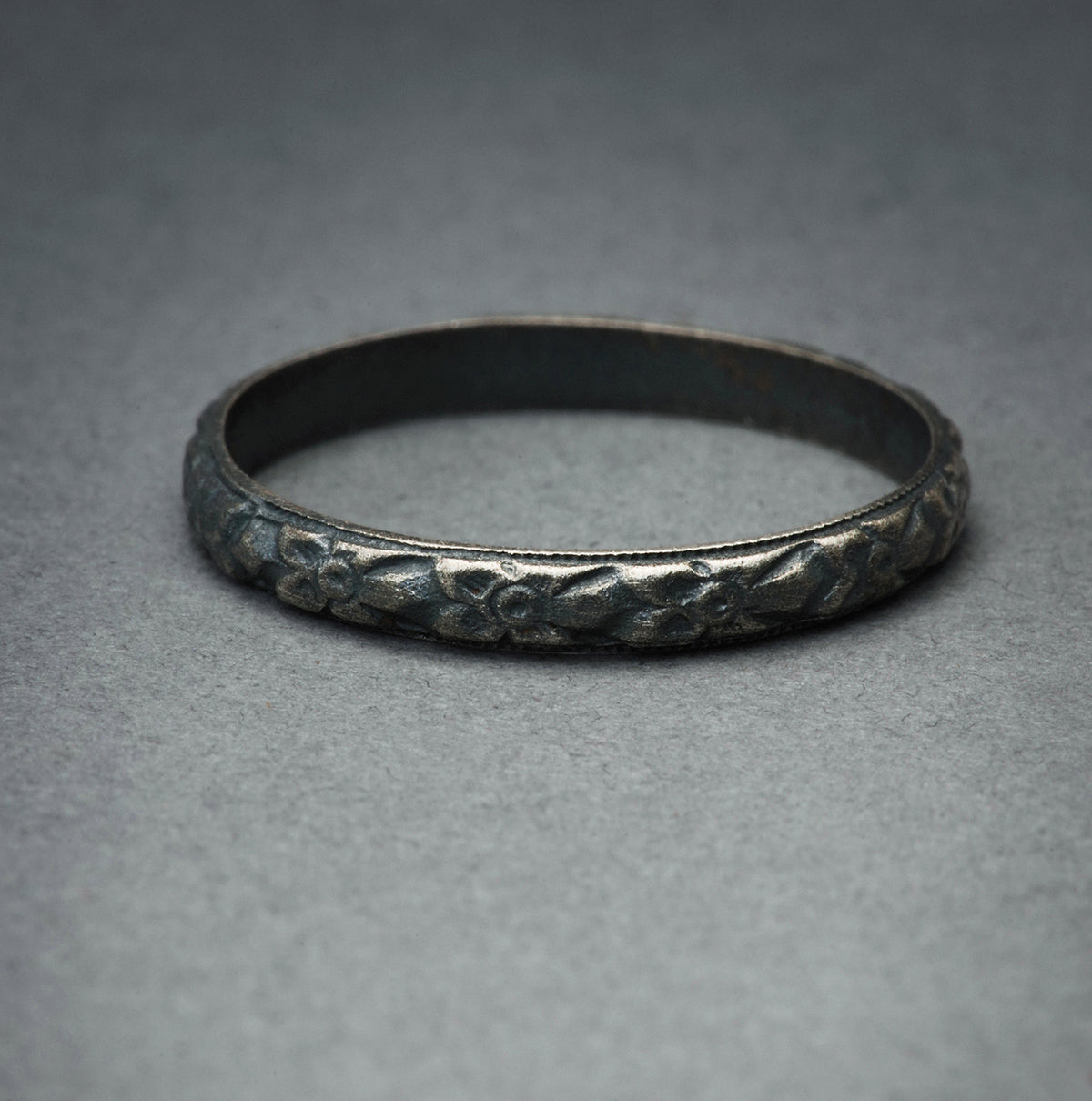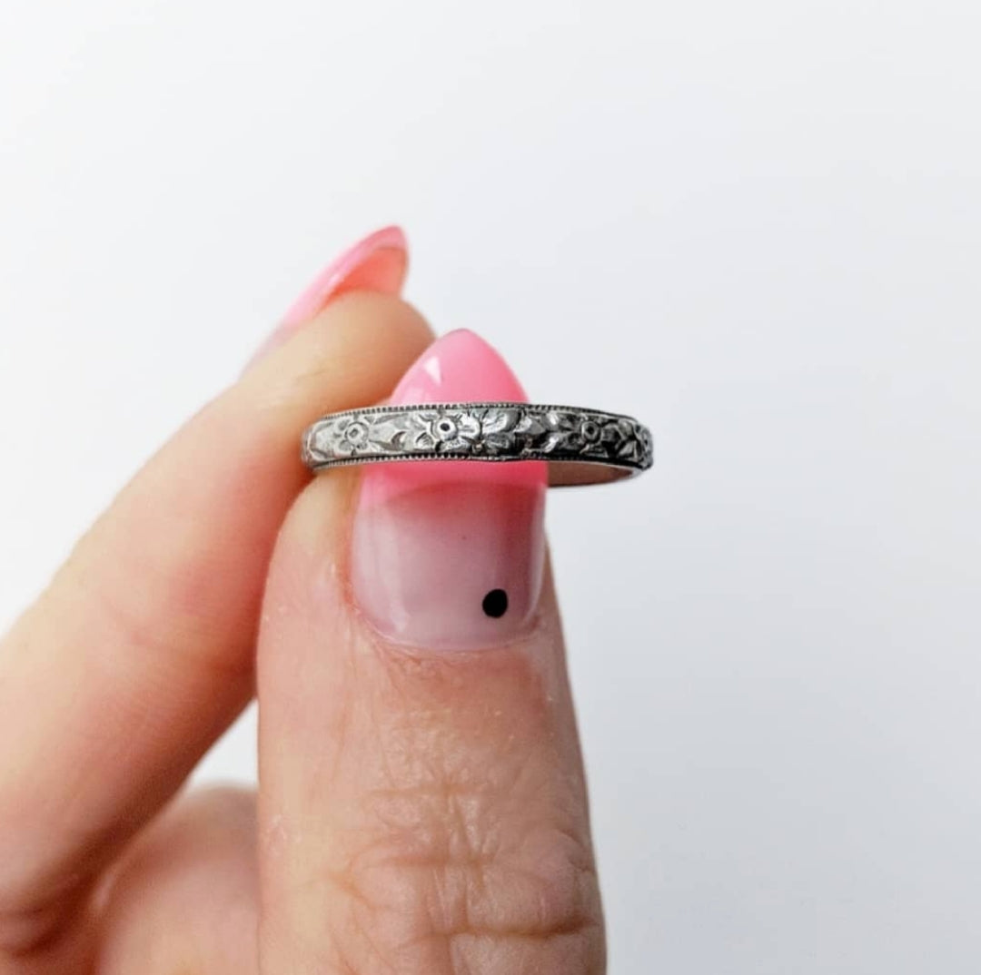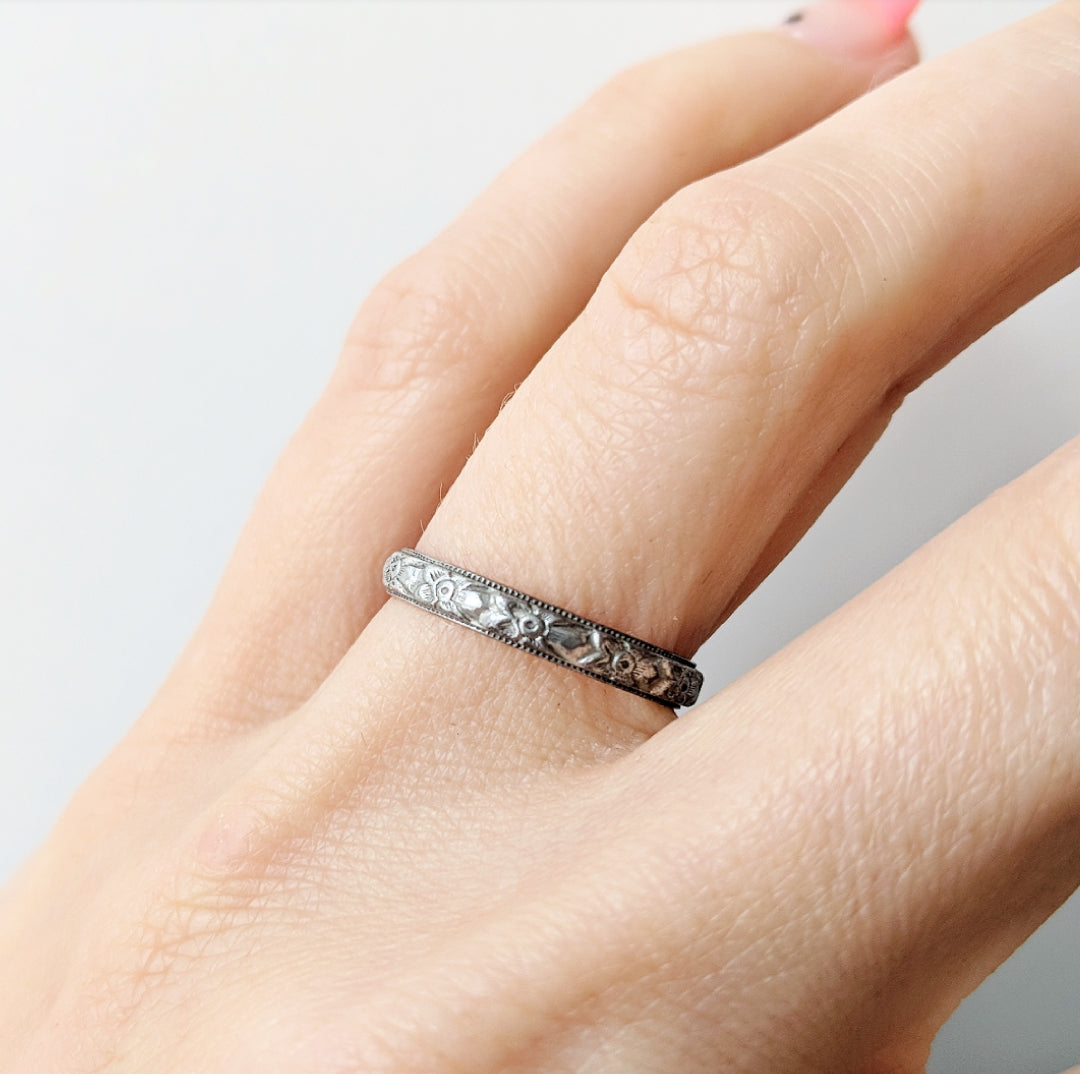 This ring is cast from a mold made from a late 1800's sterling silver hand carved floral band.