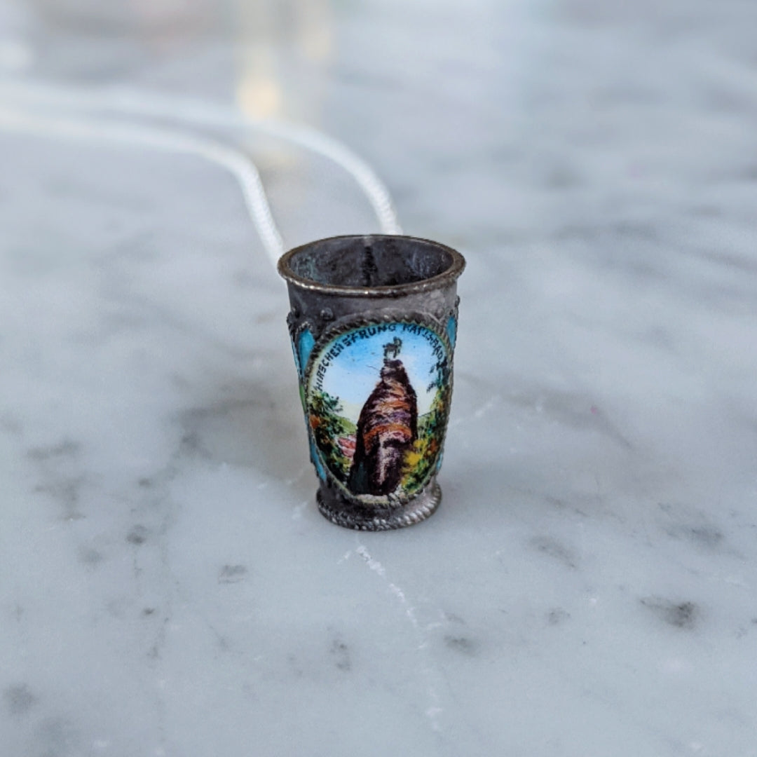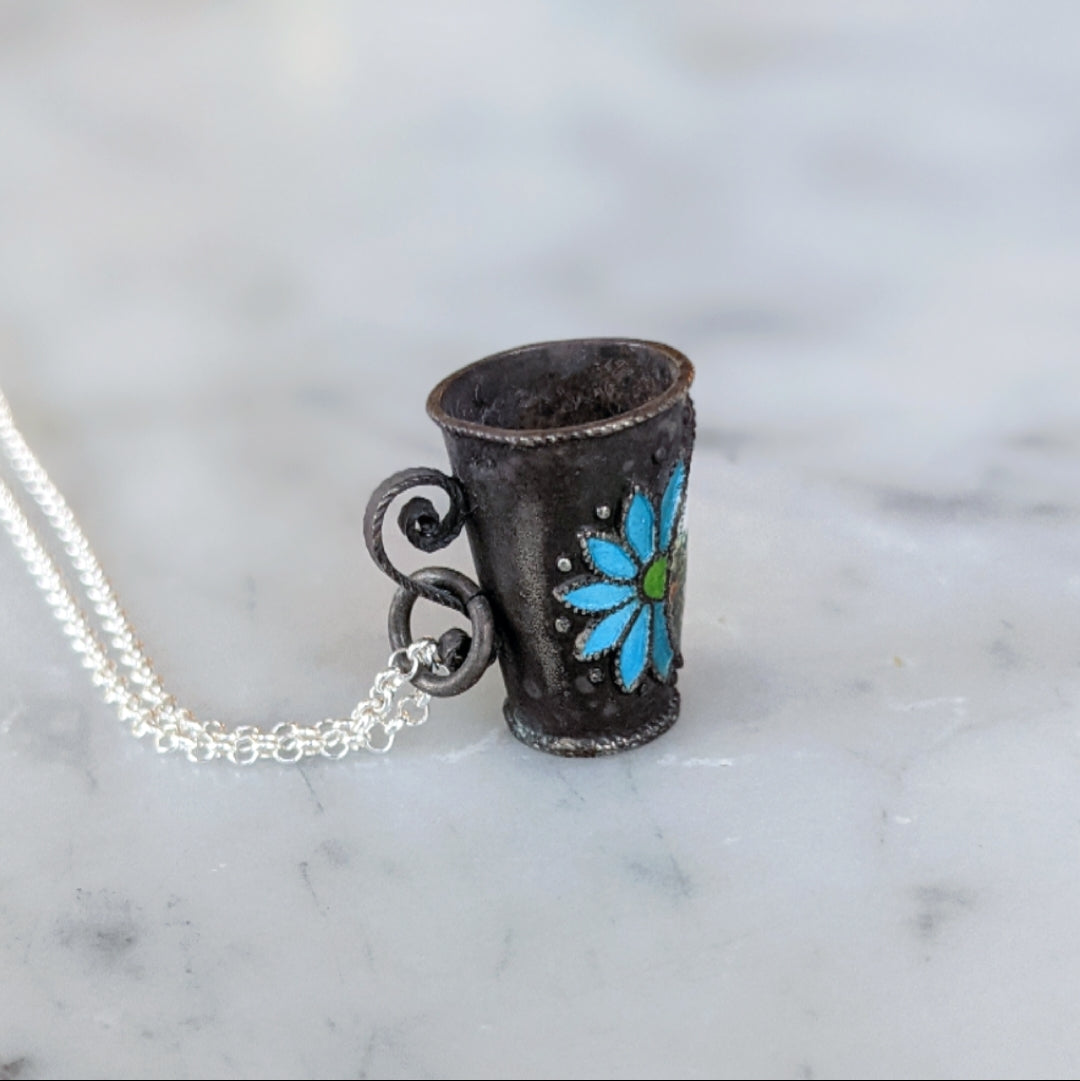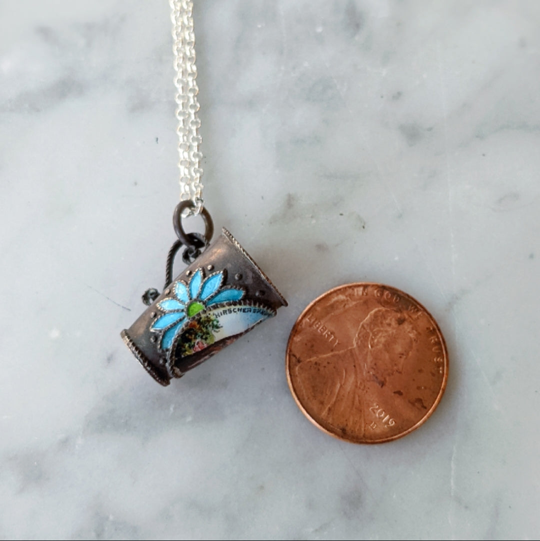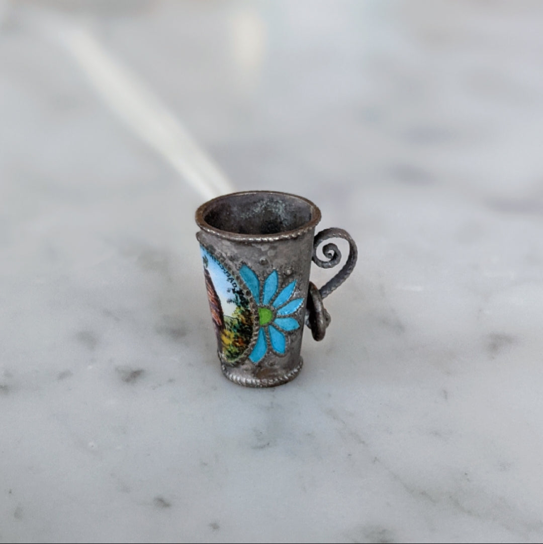 Antique beautifully enameled sterling silver cup charm featuring flowers and a mountain goat hanging from a sterling silver chain.