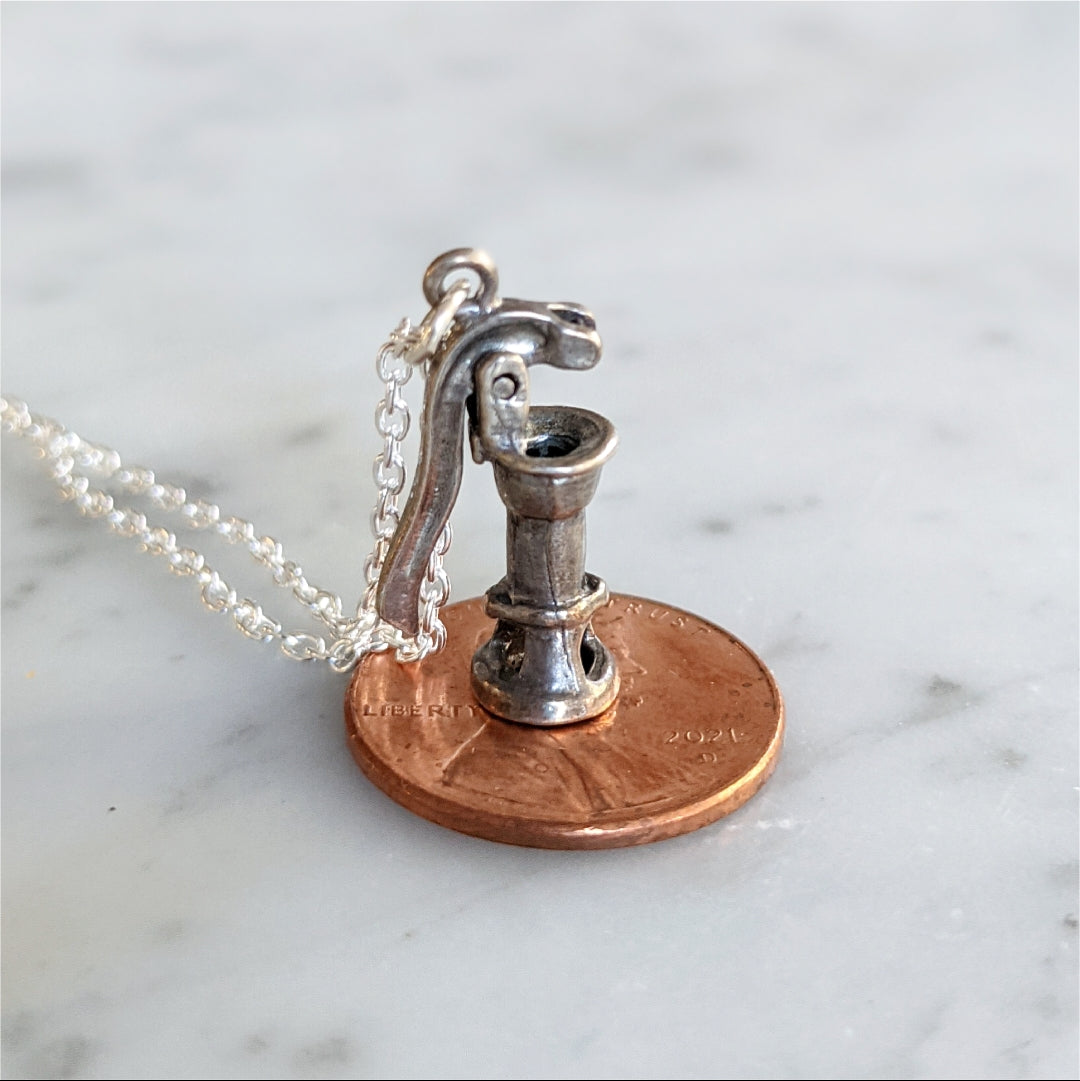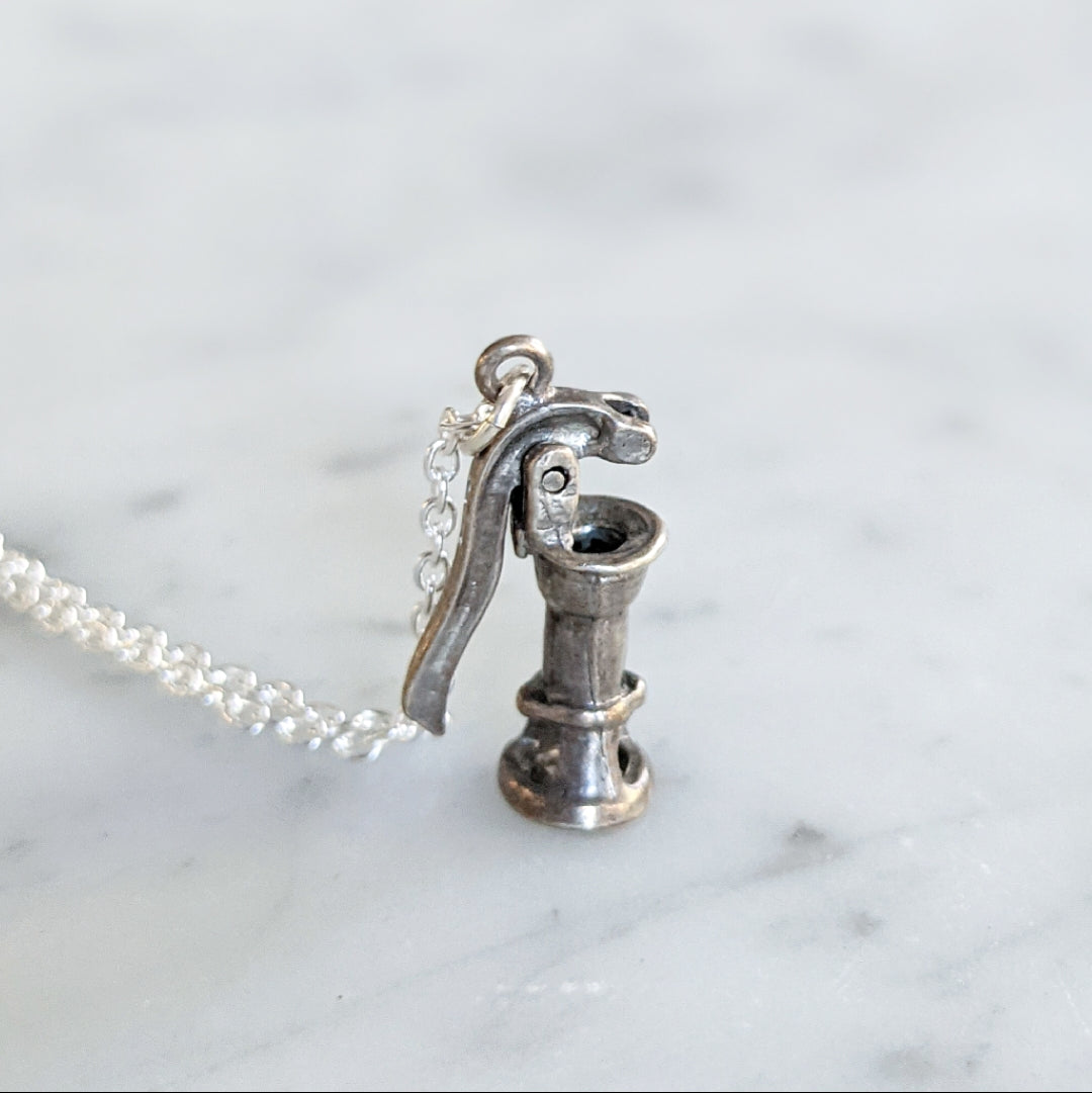 Antique sterling silver water pump charm that opens and closes hanging from a sterling silver chain.