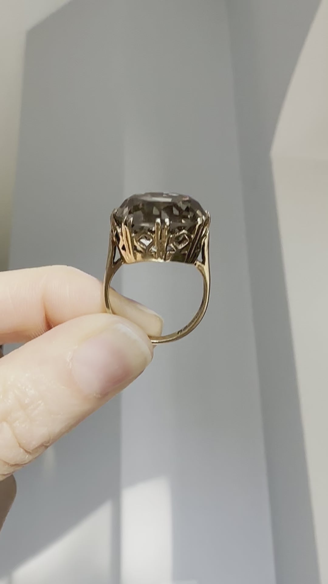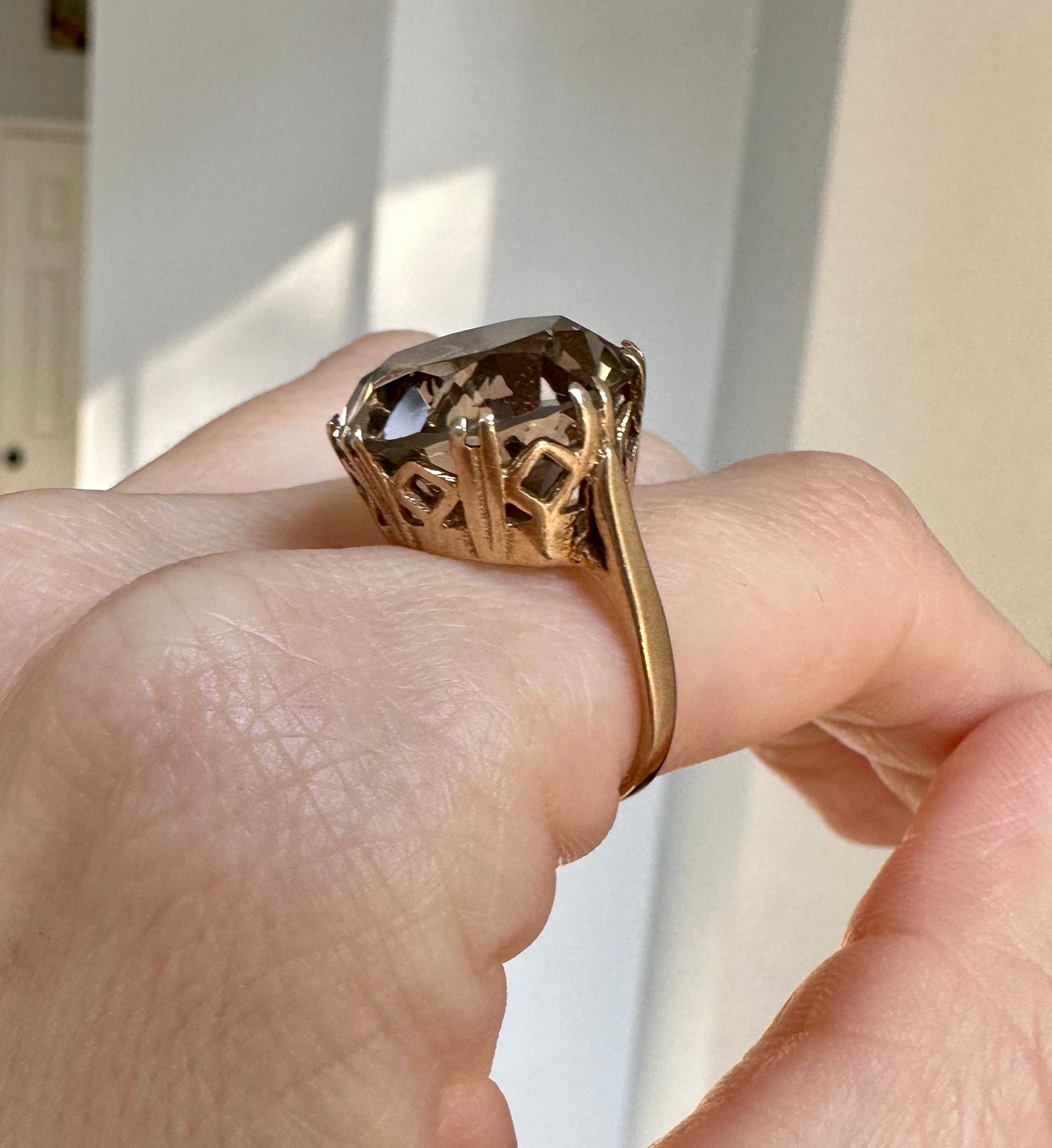 Beautiful antique 9ct gold setting adorned with a large faceted smokey quartz stone.
