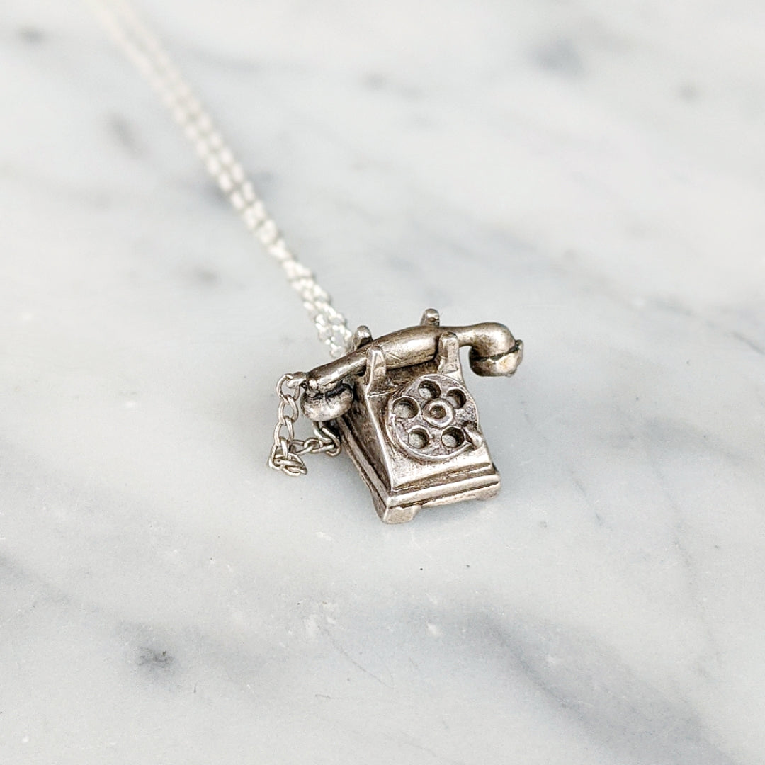 Antique sterling silver telephone with chain cord charm and spinning dial hanging from a sterling silver chain.