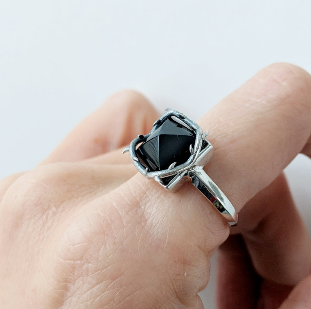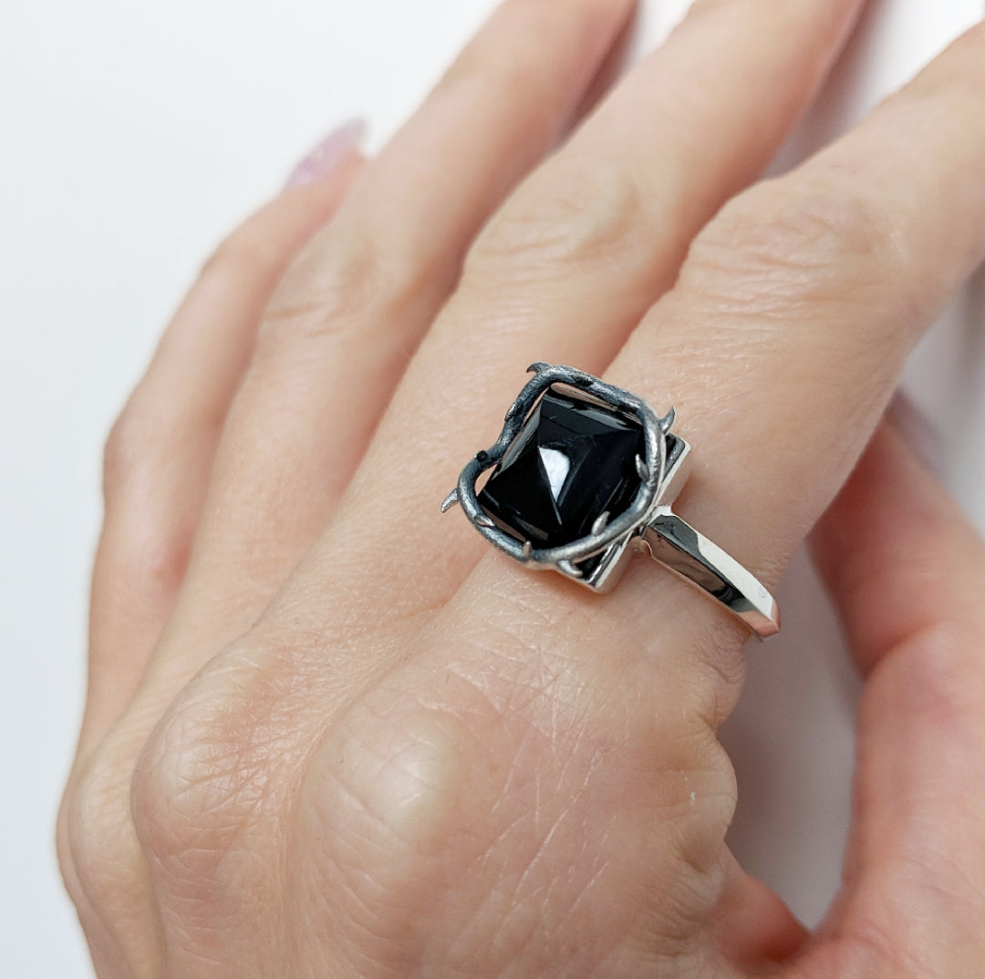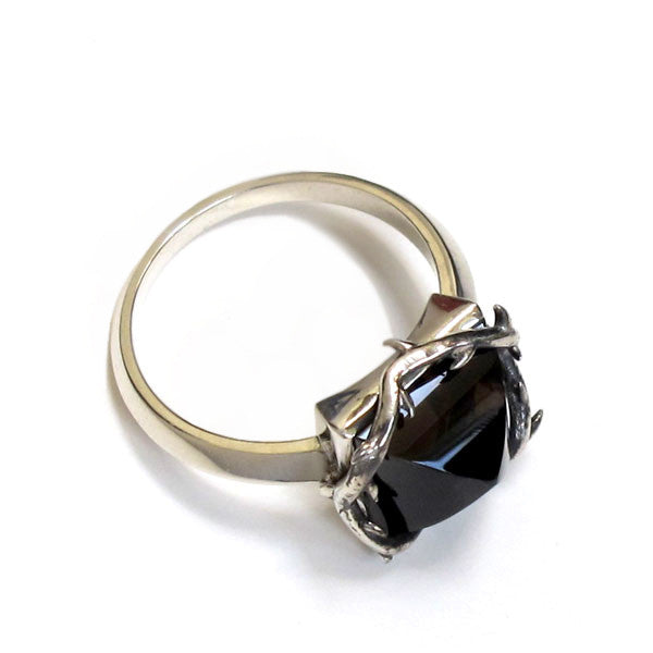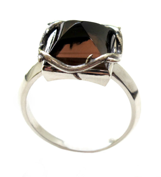 Inverted smokey quartz wrapped and set in sterling silver thorns on a sterling band.