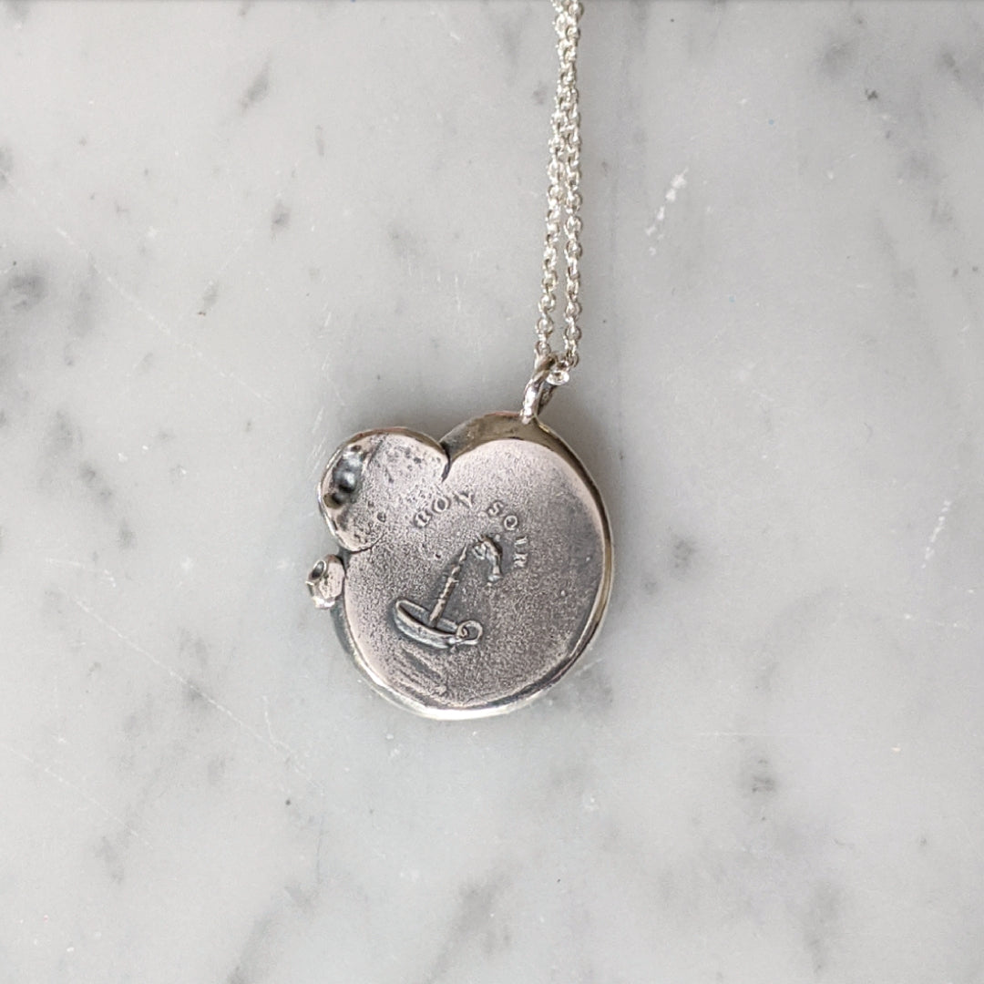 This 1" tall sterling silver charm is made from an antique wax seal that was hand carved in the 1800's. This charm has a candlestick and reads "Bon Soir" which translates to "good evening," it hangs from a sterling silver chain.