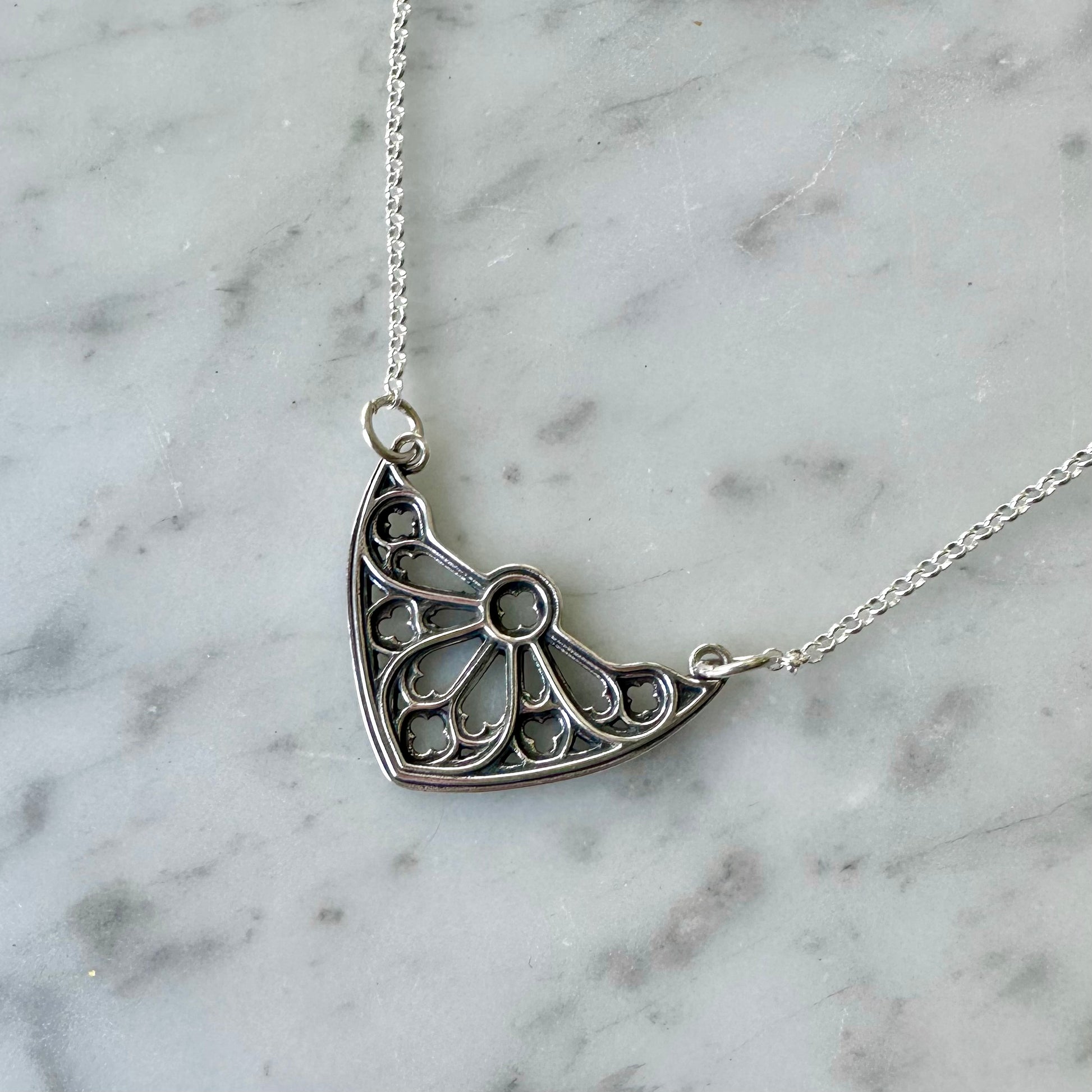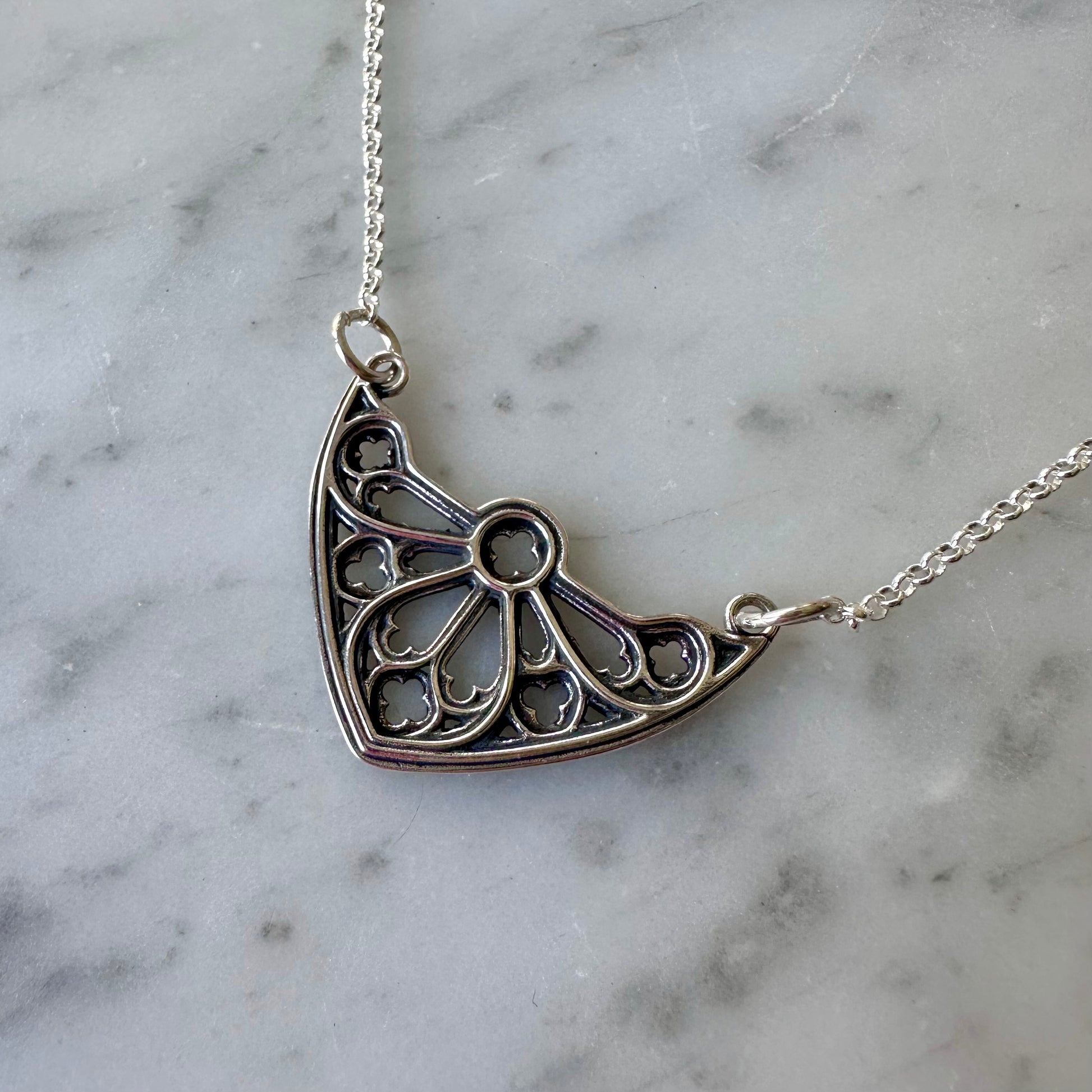 Vintage sterling silver highly detailed cathedral window pendant hanging from a sterling silver chain.