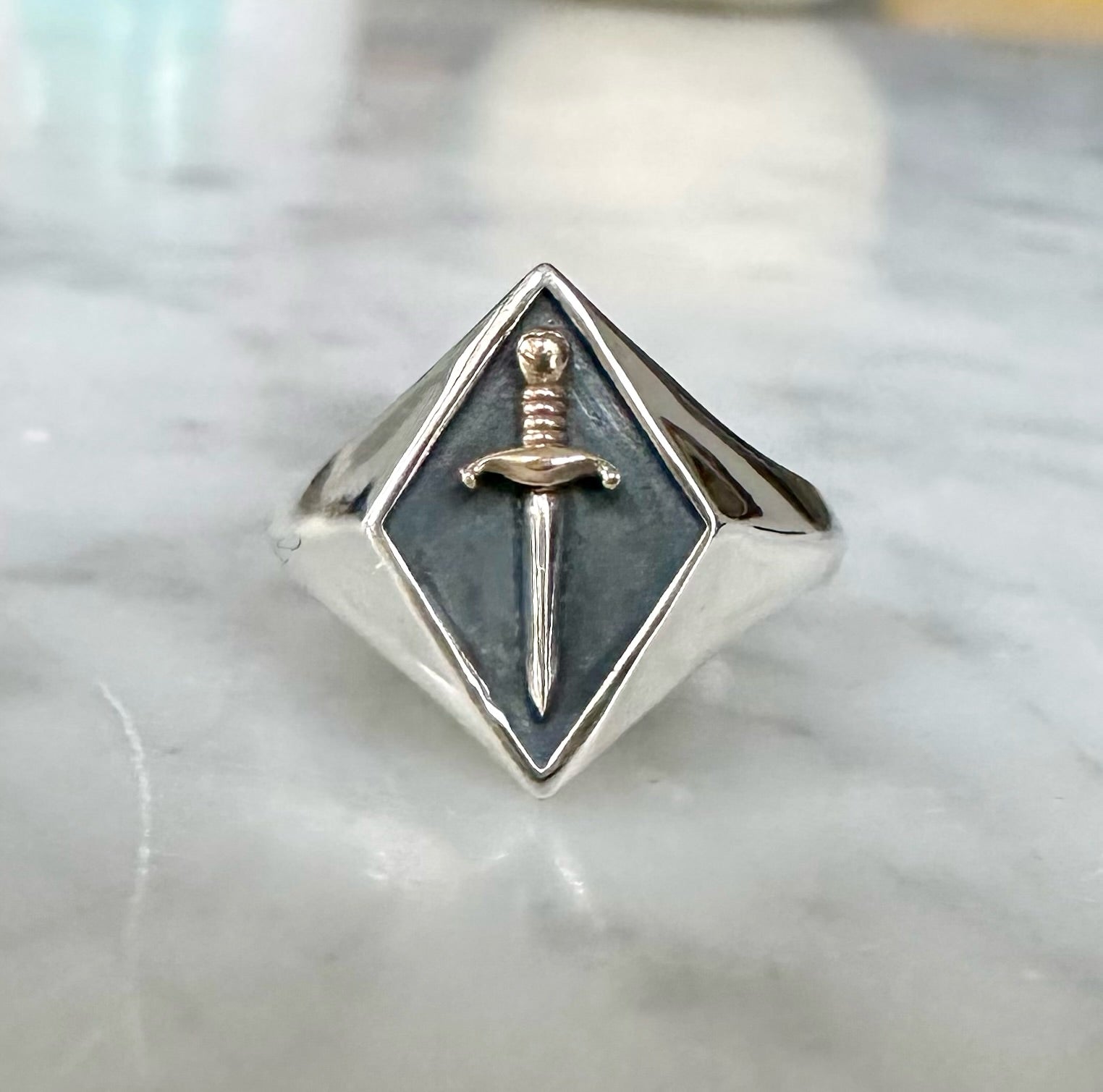 Sterling silver signet ring featuring a dagger with bronze handle detail.