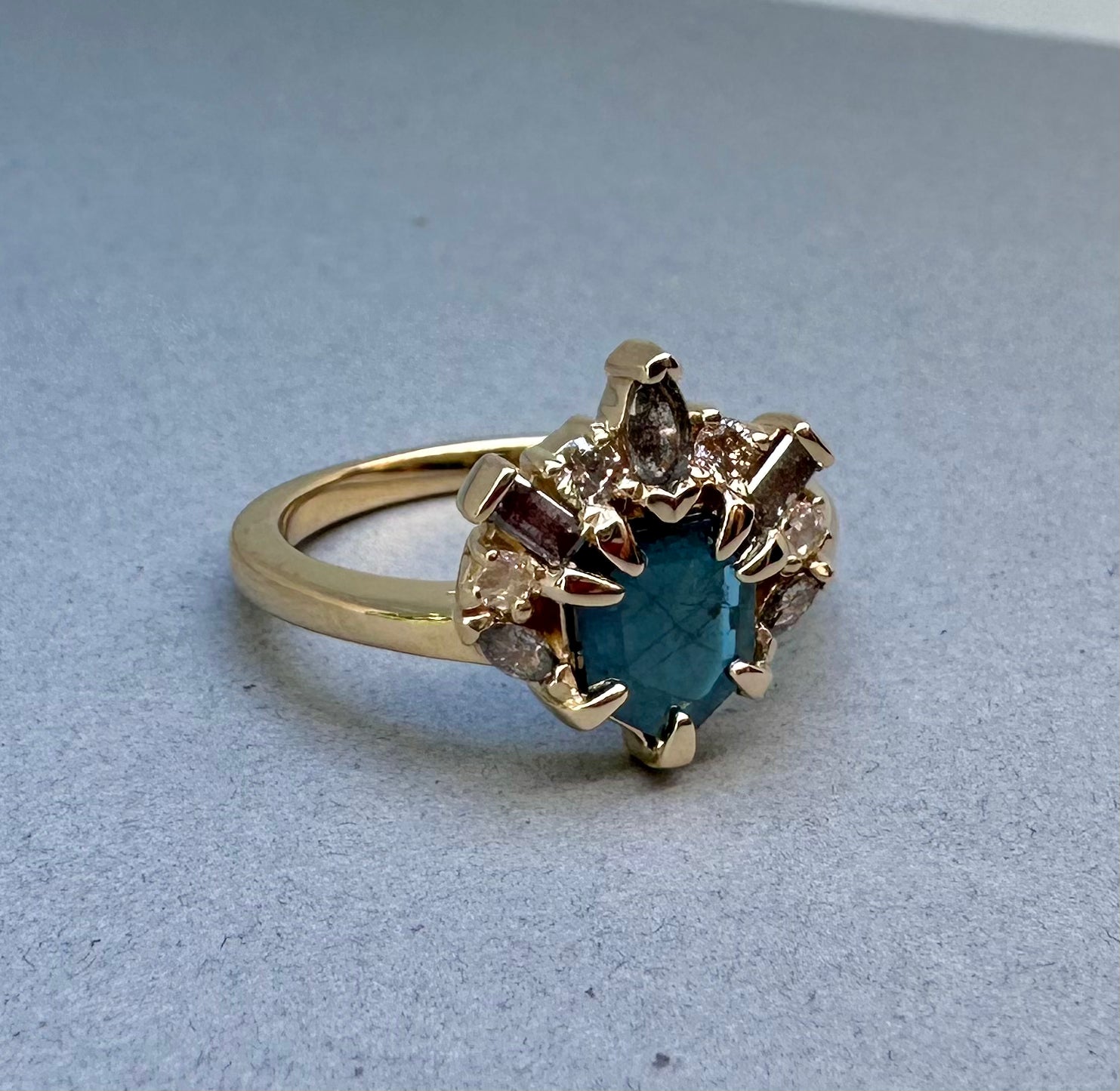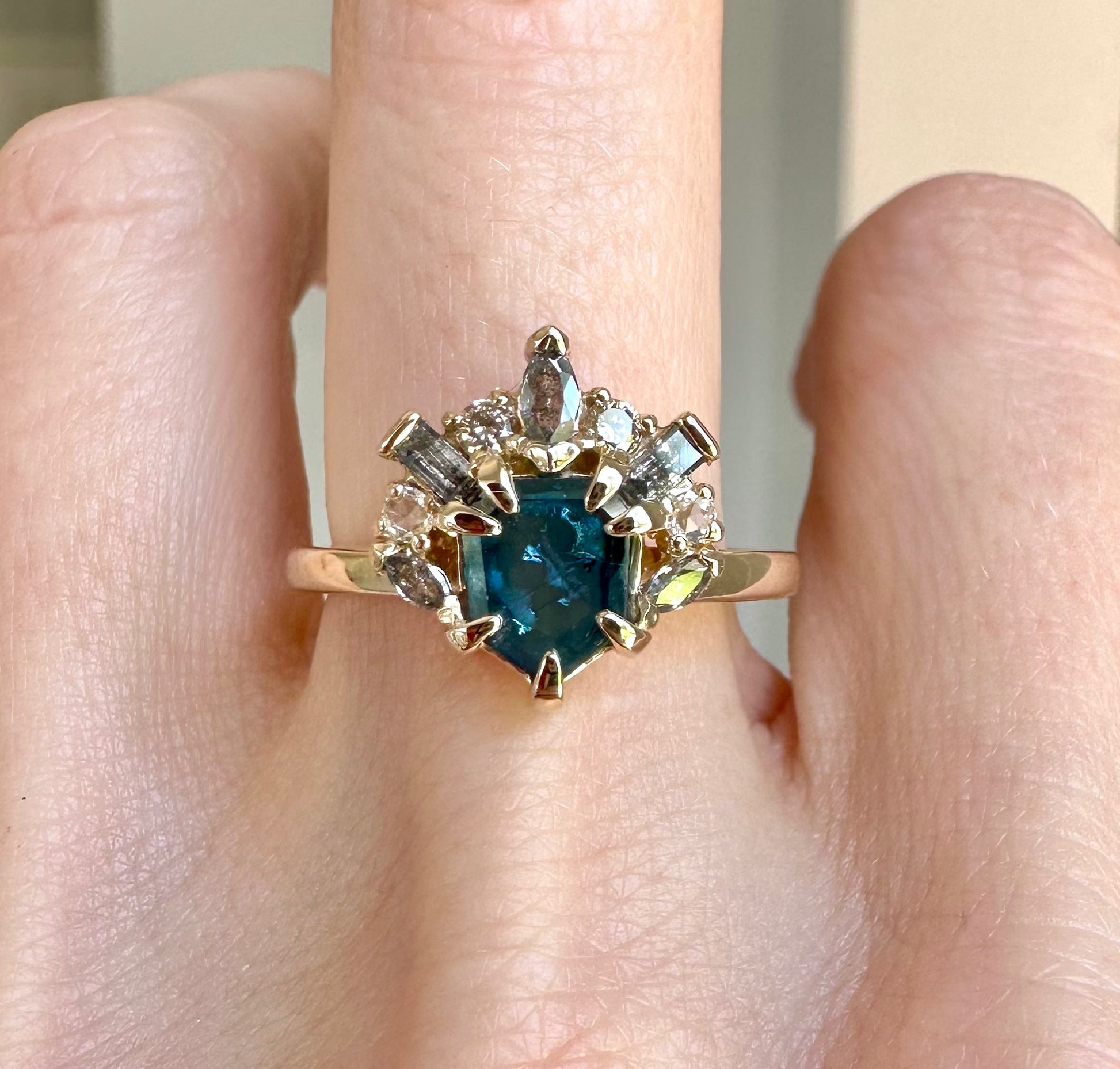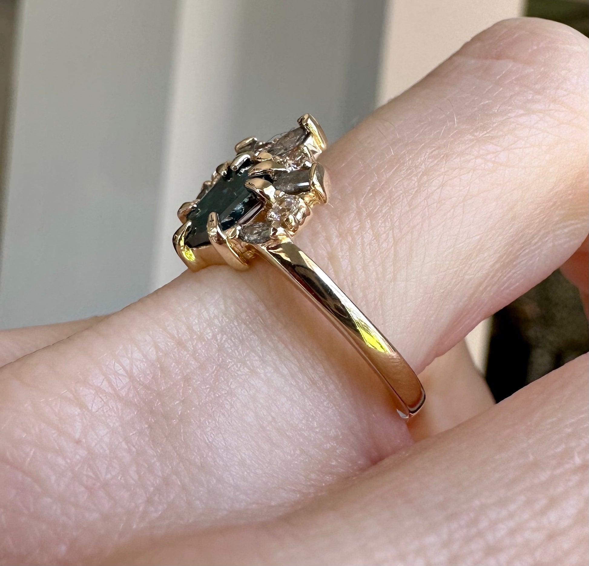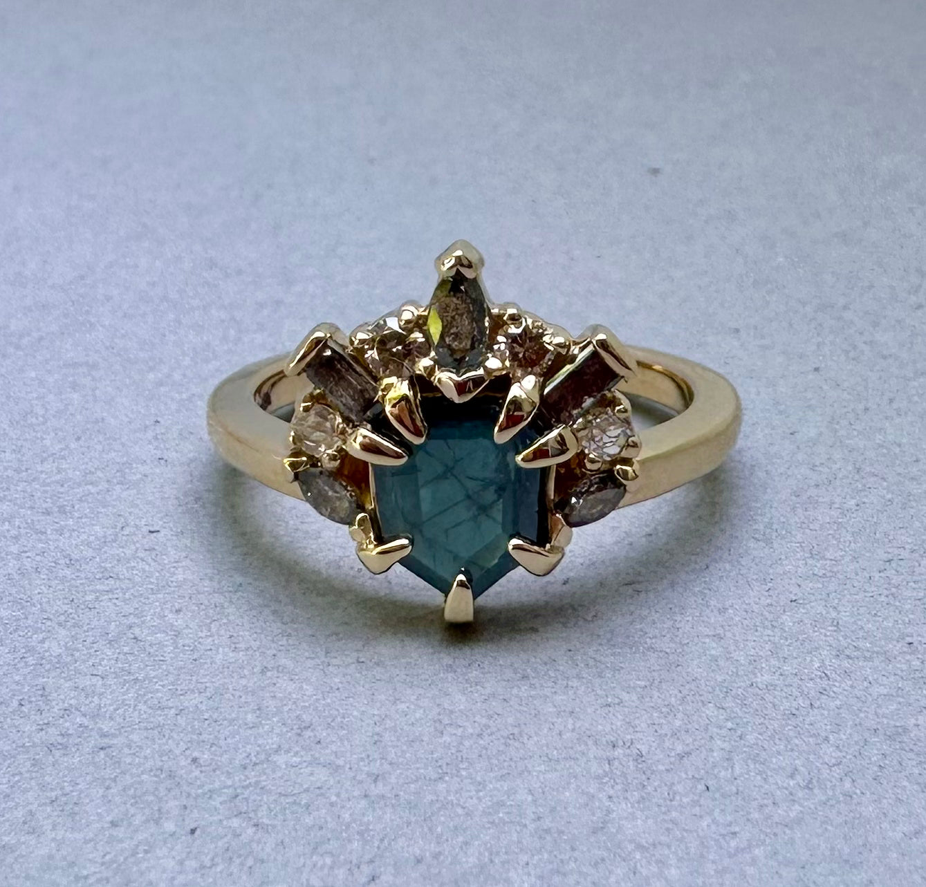 The exquisite blue diamond beam engagement ring features a stunning shield cut blue diamond center stone surrounded by a mix of salt and pepper marquise and baguette diamonds, as well as champagne and white melee diamonds. Its Victorian-inspired design blends classic and modern, crafted from 14 carat gold for a luxurious finish.