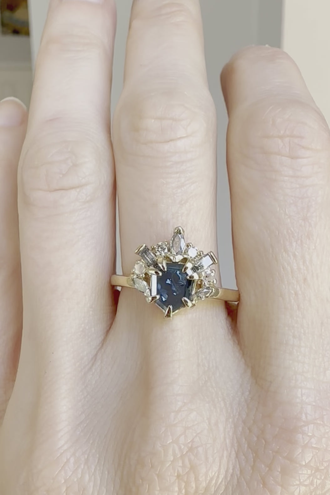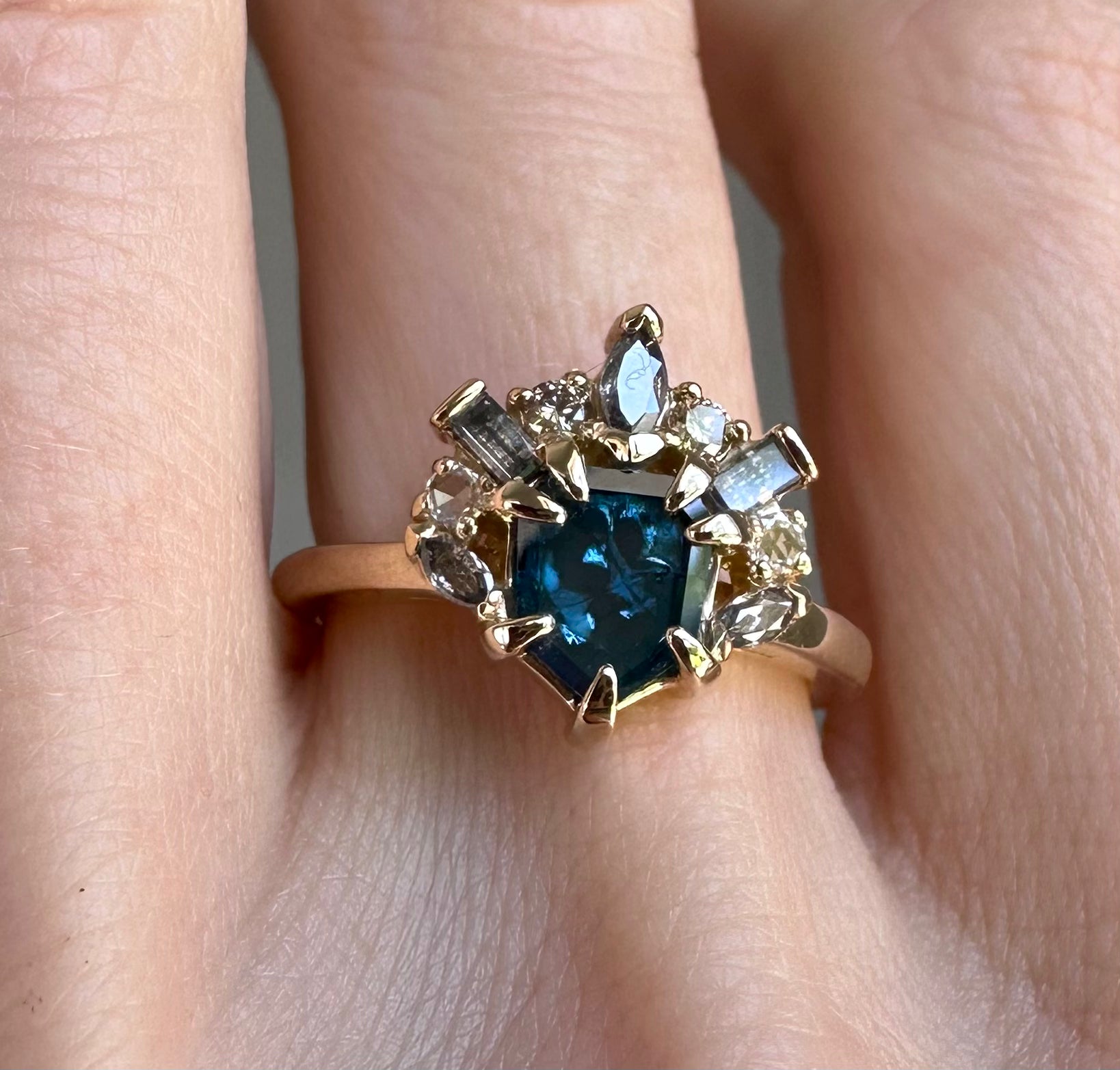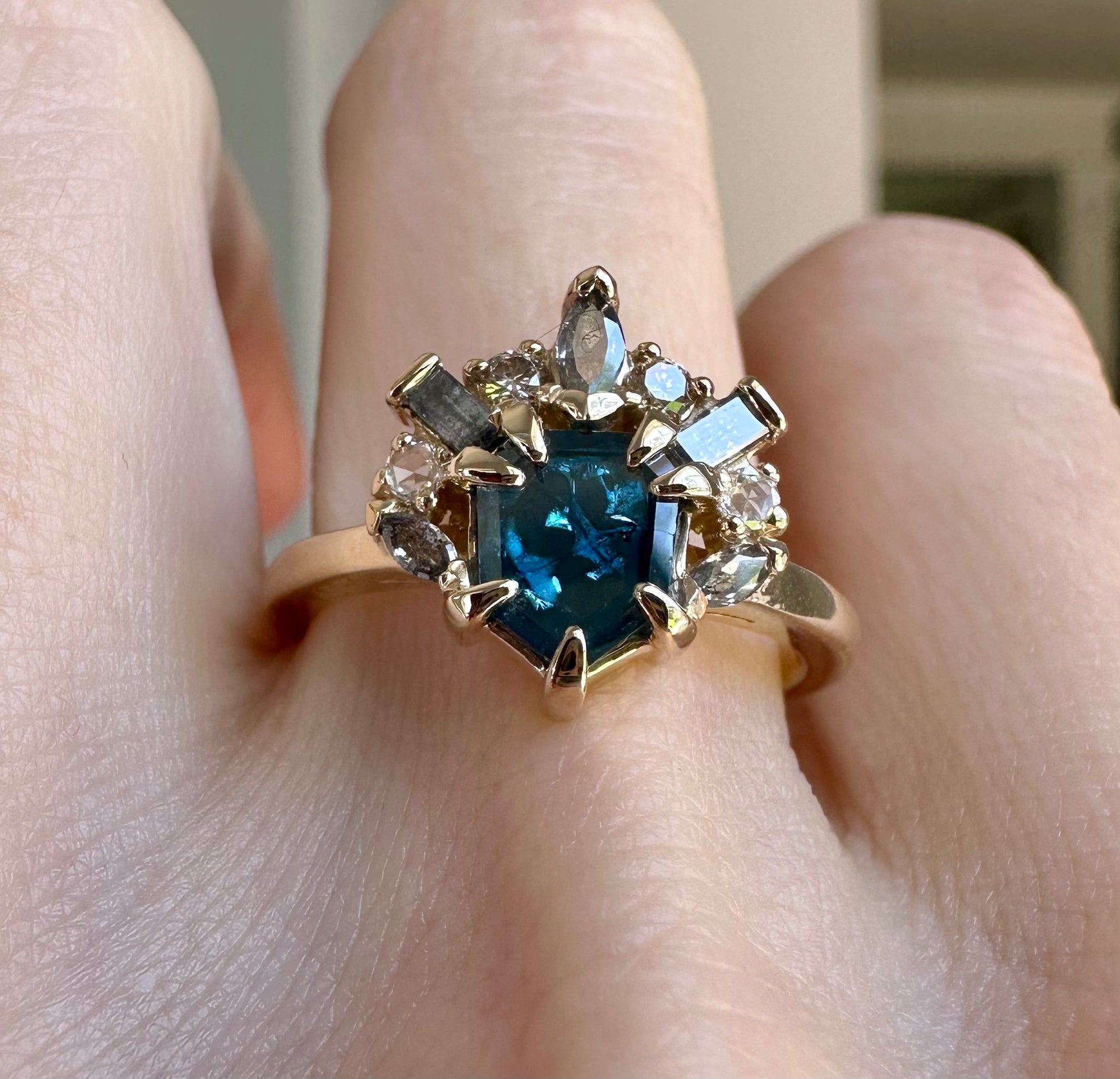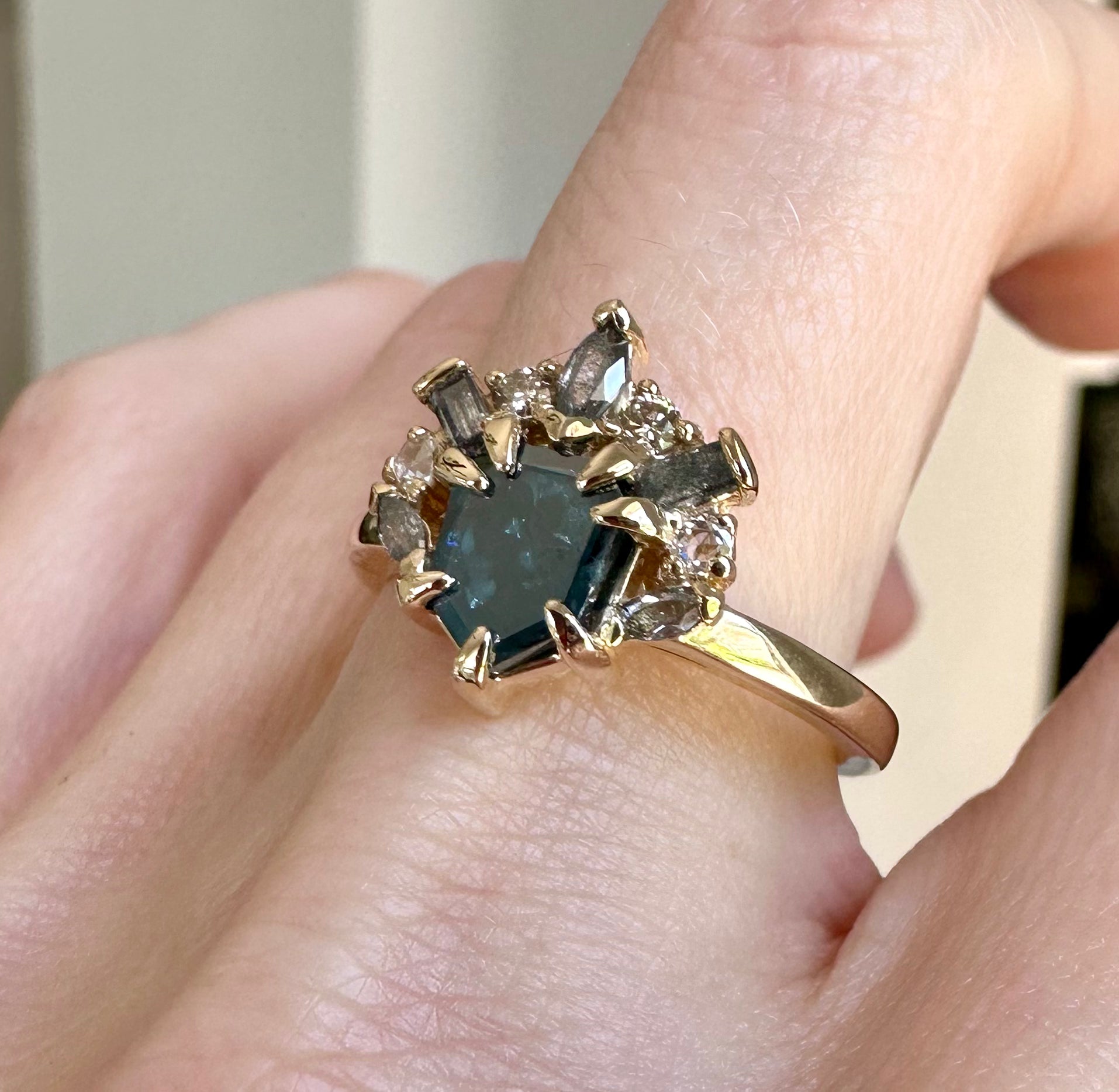 The exquisite blue diamond beam engagement ring features a stunning shield cut blue diamond center stone surrounded by a mix of salt and pepper marquise and baguette diamonds, as well as champagne and white melee diamonds. Its Victorian-inspired design blends classic and modern, crafted from 14 carat gold for a luxurious finish.