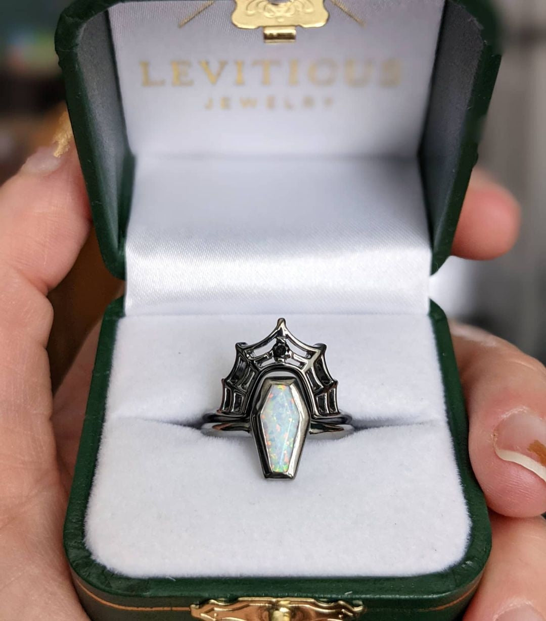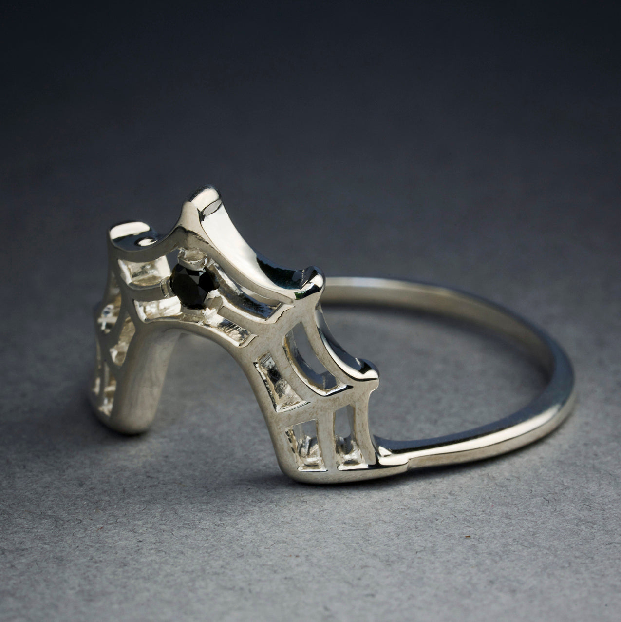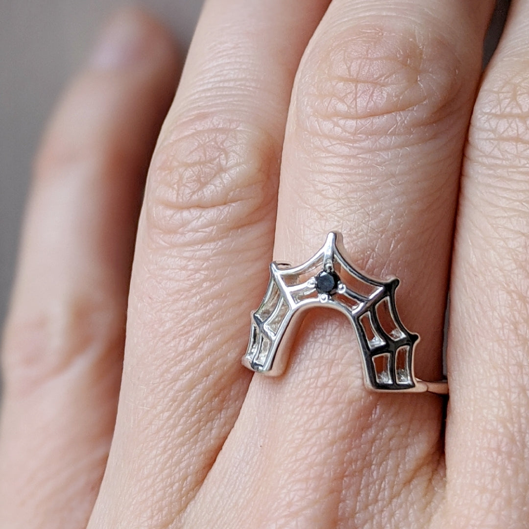 Hand cast spider web ring adorned with a black diamond that fits perfectly atop our Coffin Rings or looks beautiful on it's own.
