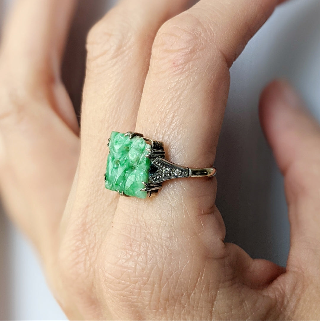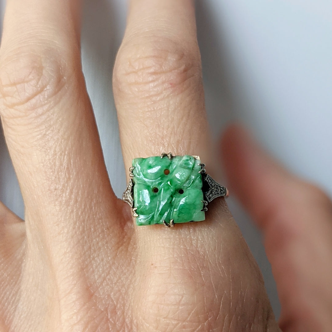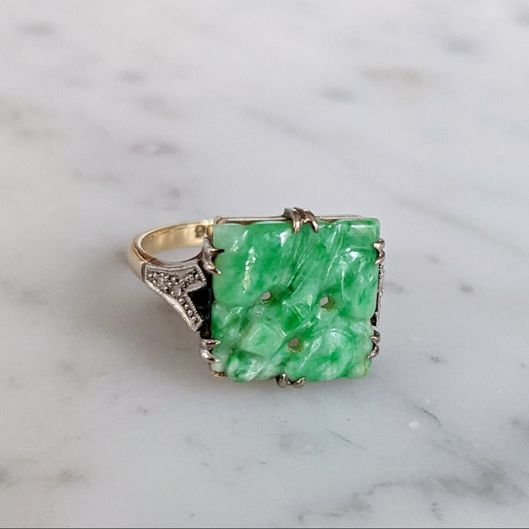 Edwardian Diamond and Carved Jade 9ct Platinum Ring