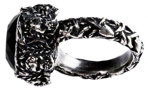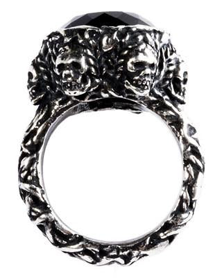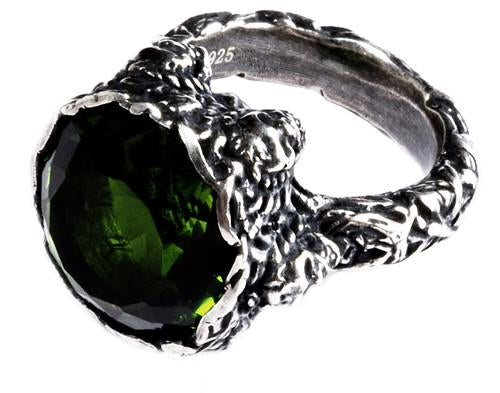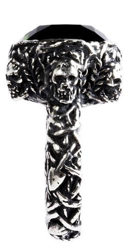 925 sterling silver memento mori ring band detailed with gravedigger tools echoing ornamentation of funeral tracts of the 1600's, skulls adorned with laurel round the sides of the bezel holding a faceted deep emerald cz crystal.