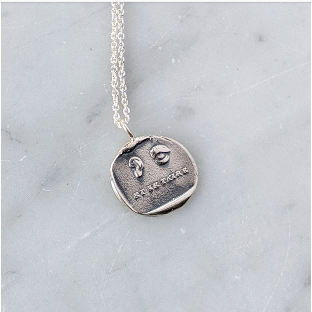 This 1/4" tall sterling silver charm is made from an antique wax seal that was hand carved in the 1800's. This charm has an ear and eye and reads "Et Se Taire" which translates to "and be silent," it hangs from a sterling silver chain.