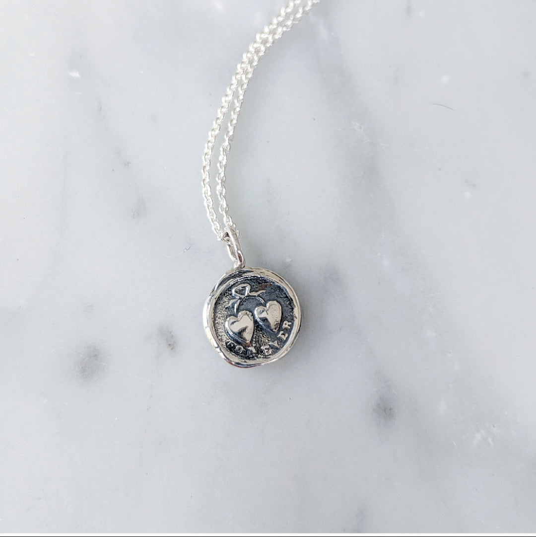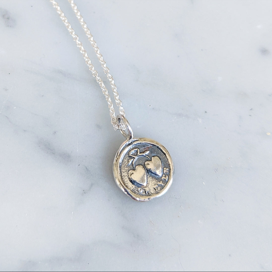 This 1/4" tall sterling silver charm is made from an antique wax seal that was hand carved in the 1800's. This charm has two hearts that reads "forever" underneath and it hangs from a sterling silver chain.