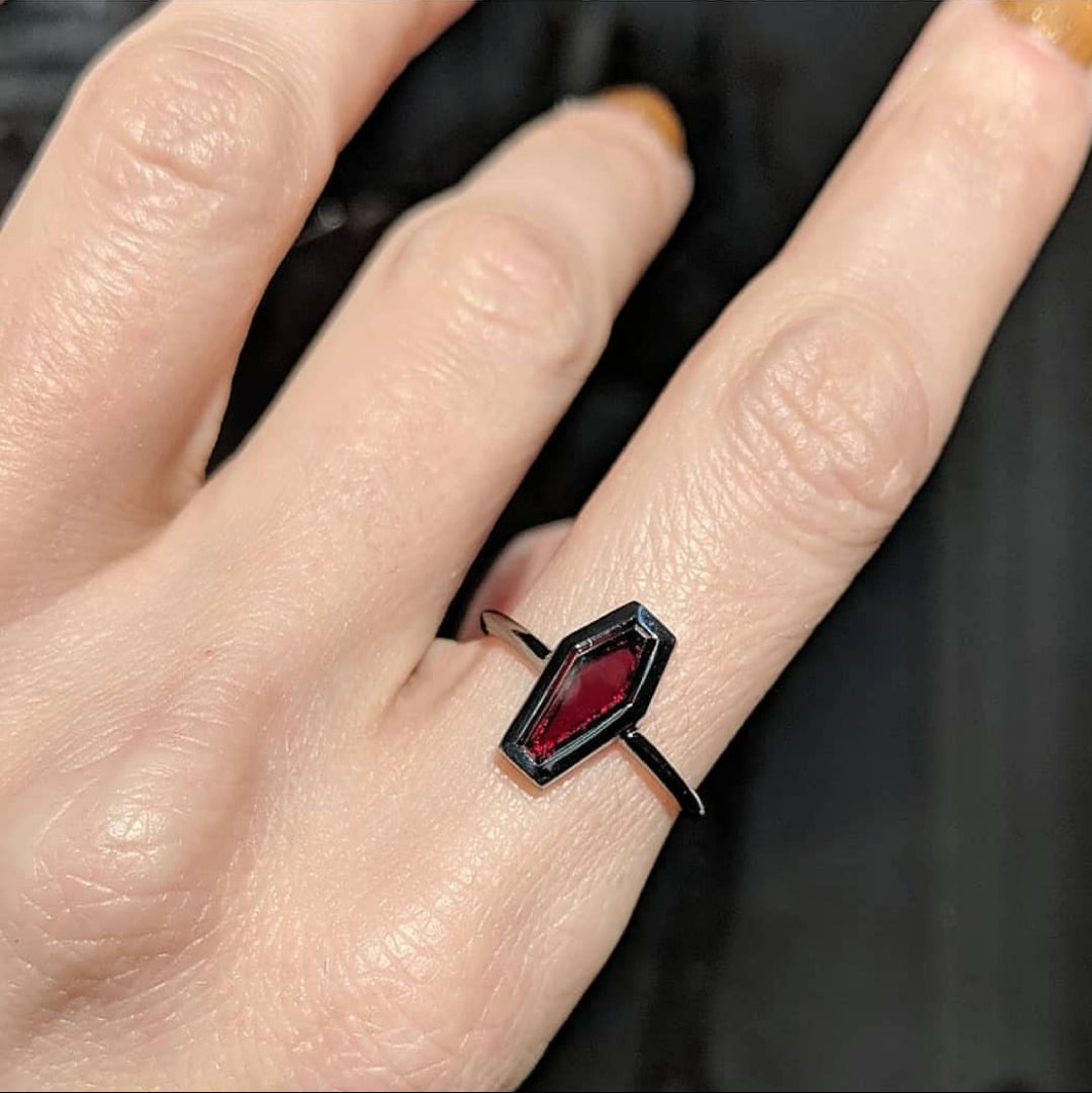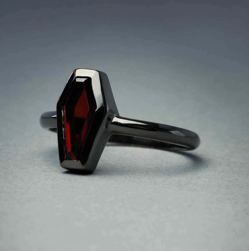 11mm tall coffin cut garnet in your choice of a 10k, 14k, or sterling silver setting.