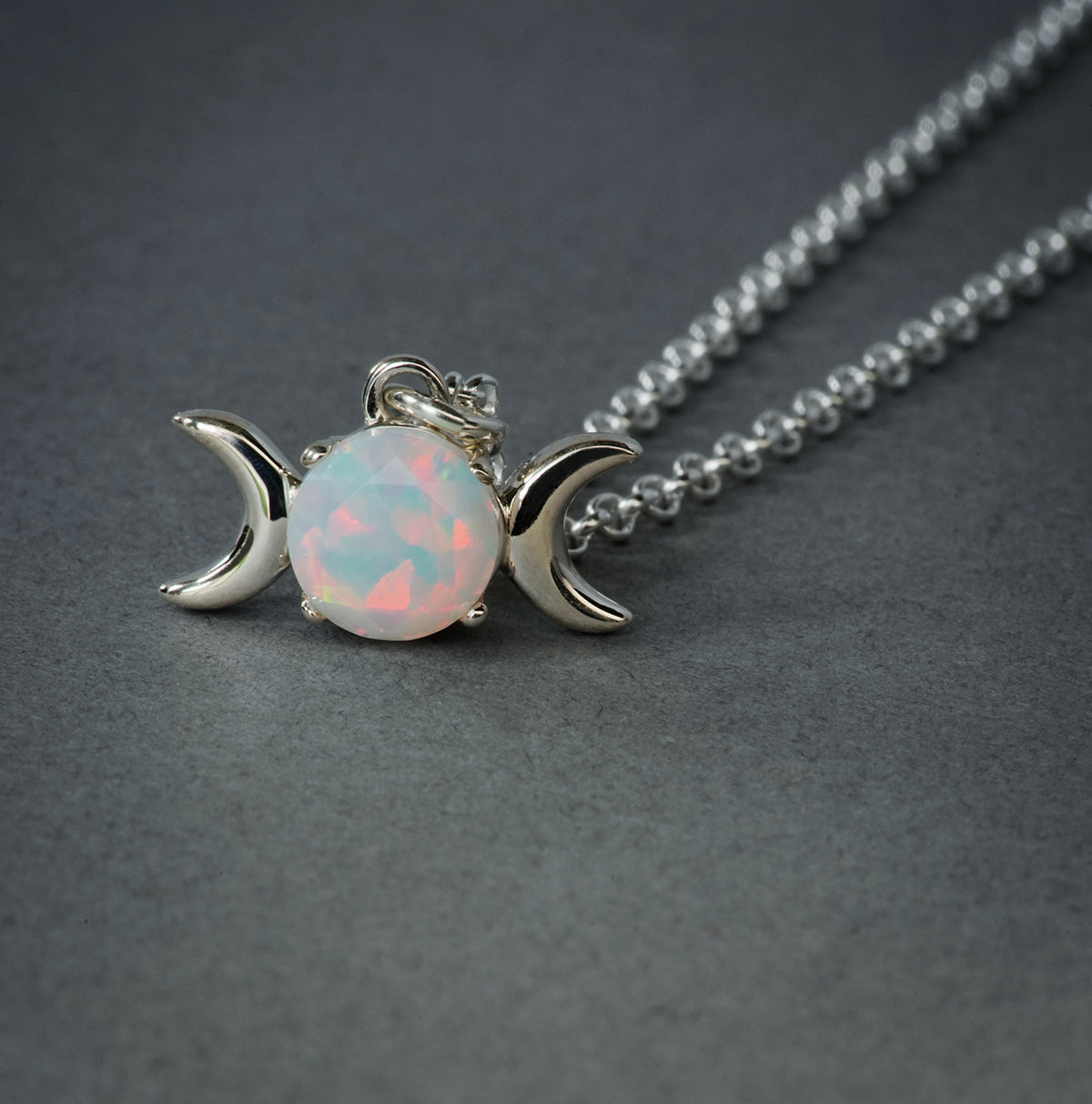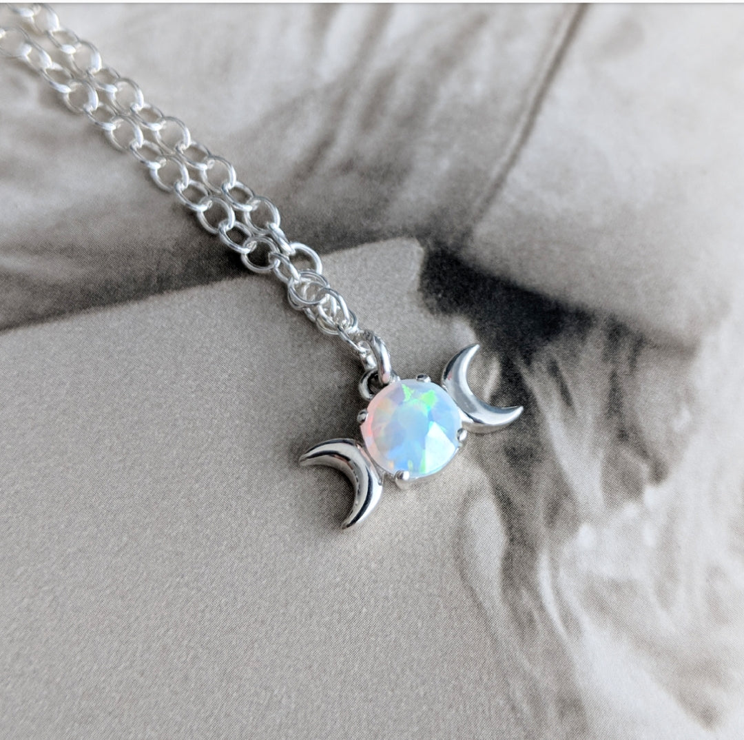 Gorgeous faceted opal between two enchanting crescent moons on a sterling silver chain.