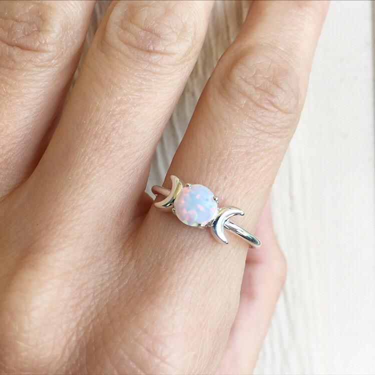 Gorgeous faceted opal between two enchanting crescent moons on a sterling silver band.