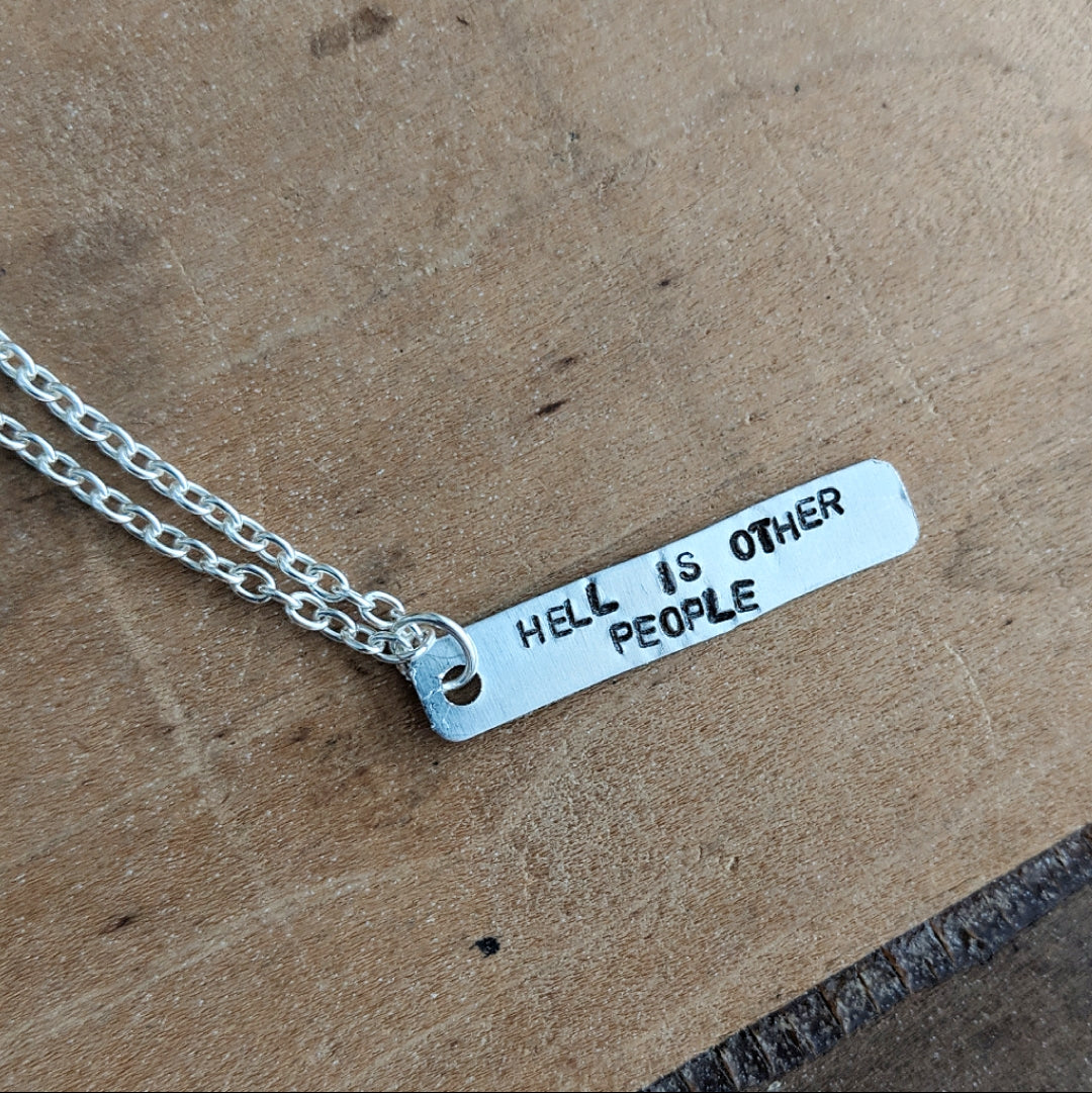 Hand stamped "hell is other people" aluminum pendant hanging from a sterling silver chain.