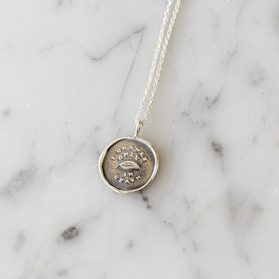 This 1/4" tall sterling silver charm is made from an antique wax seal that was hand carved in the 1800's. This charm has a leaf and reads "I change only in death" and it hangs from a sterling silver chain.