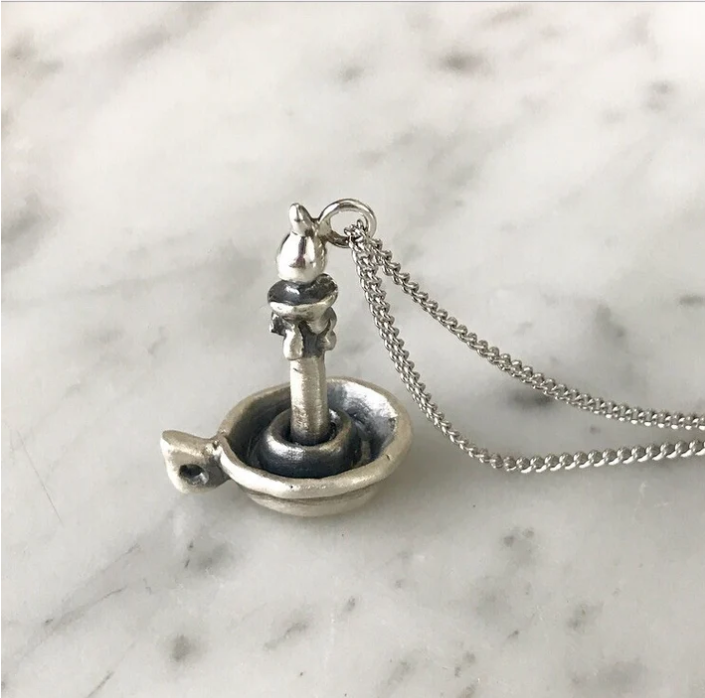 1" tall sterling silver candle and candle stick holder charm cast from a hand carved wax mold and hanging from a sterling silver chain.