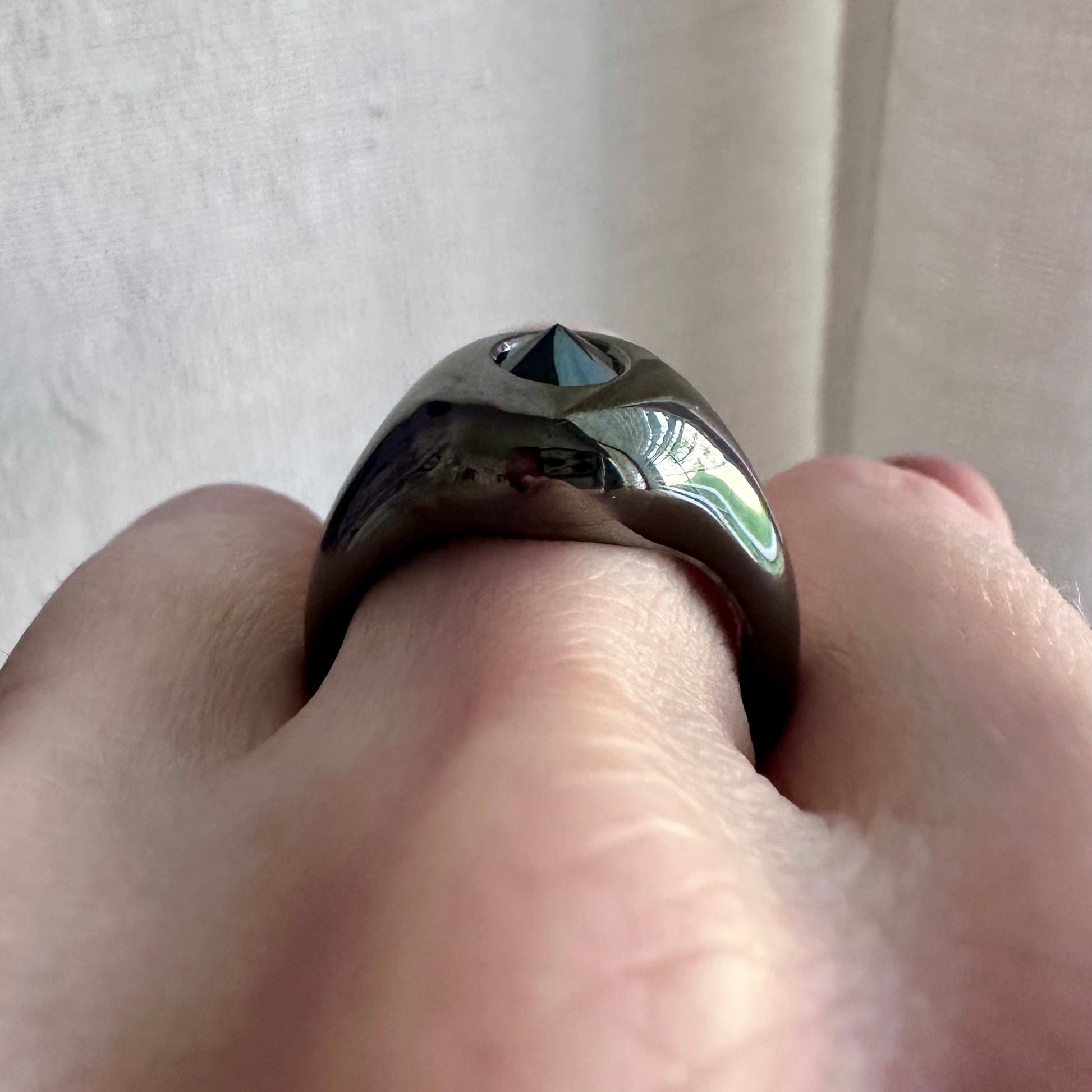 Beautiful and elegant gunmetal plated sterling silver cast ring adorned with an inverted faceted black crystal.