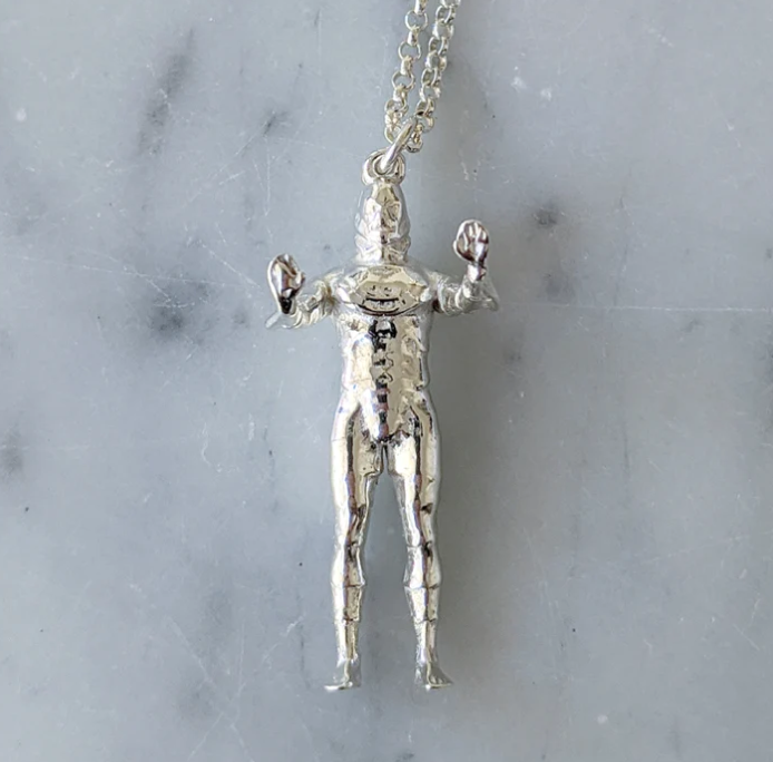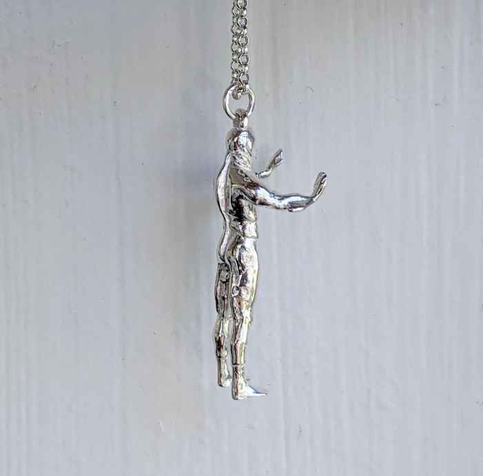 Highly 360 degree detailed sterling silver Gill-Man charm hanging from a 17" sterling silver chain.