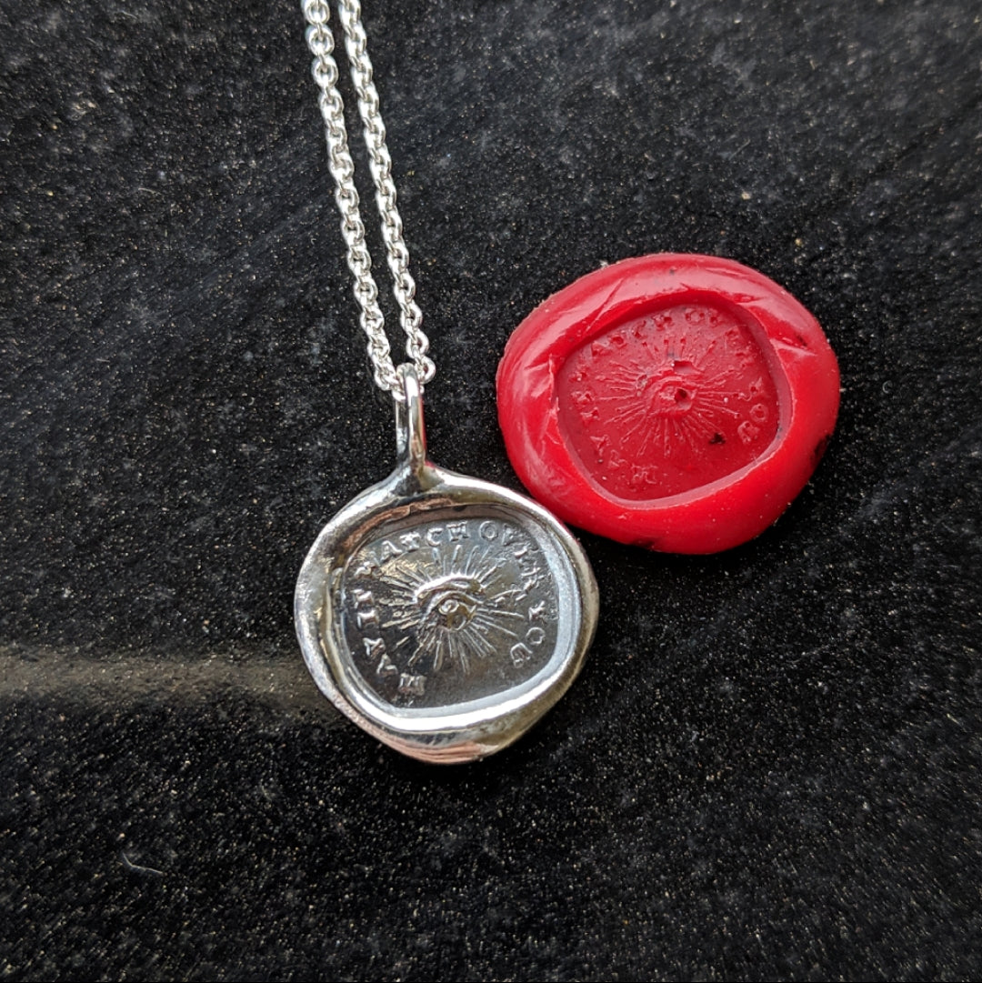 This 1/2" tall sterling silver charm is made from an antique wax seal that was hand carved in the 1800's. This charm says "May It Watch Over You" and has an all seeing eye, it hangs from a sterling silver chain.