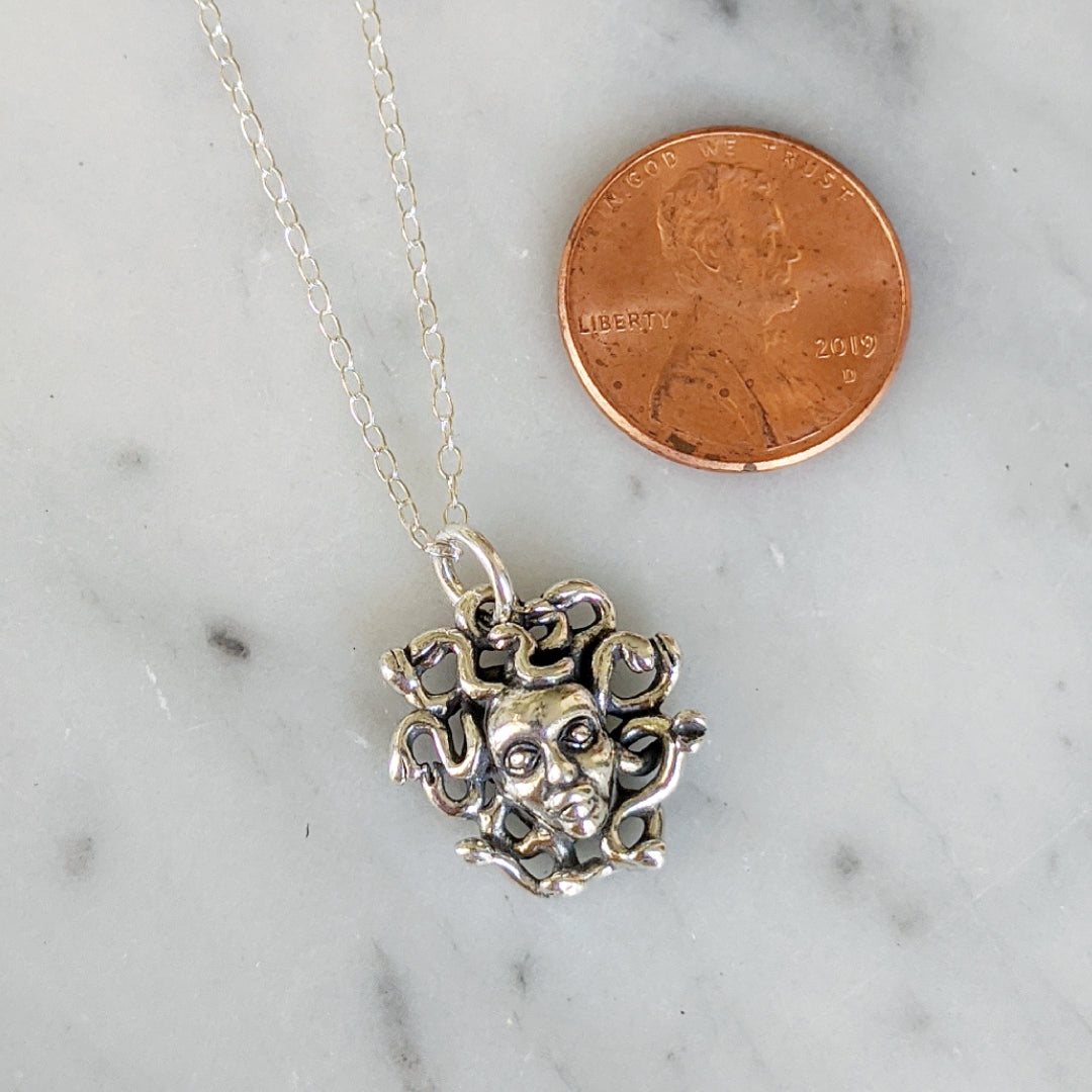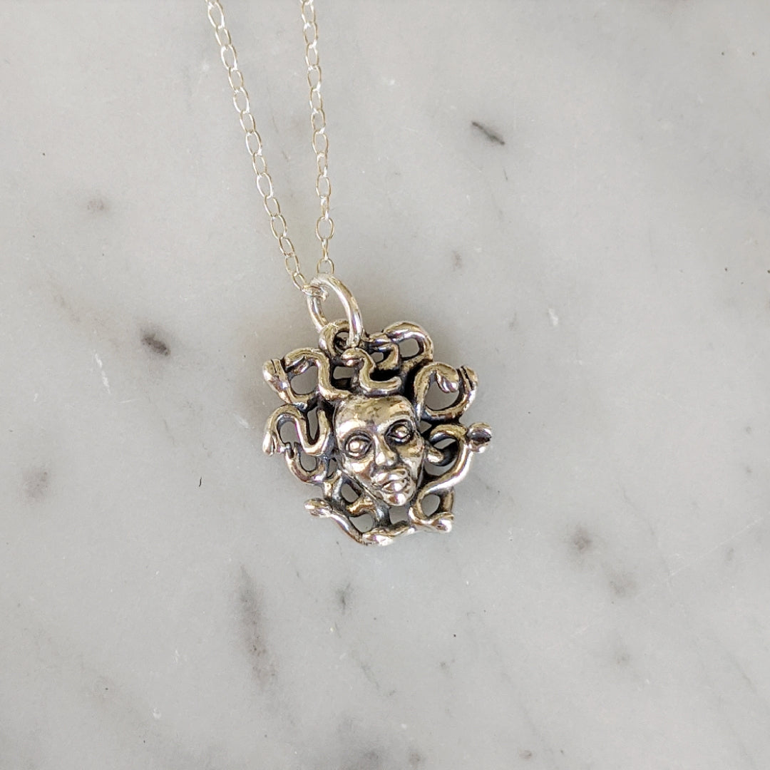 Sterling silver Medusa pendant hanging from a sterling silver chain.