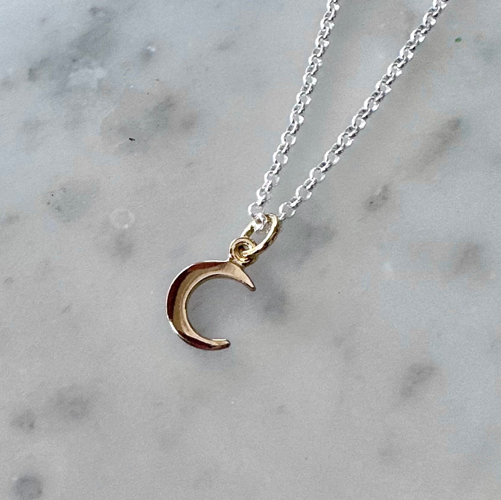 8mm bronze crescent moon charm hanging from a sterling silver chain.