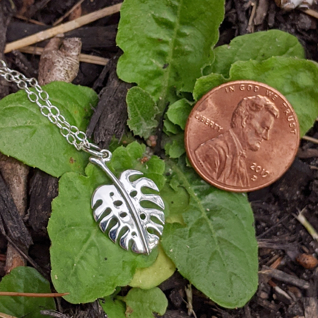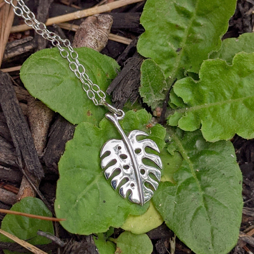 Sterling silver monsters leaf hanging from a sterling silver chain.