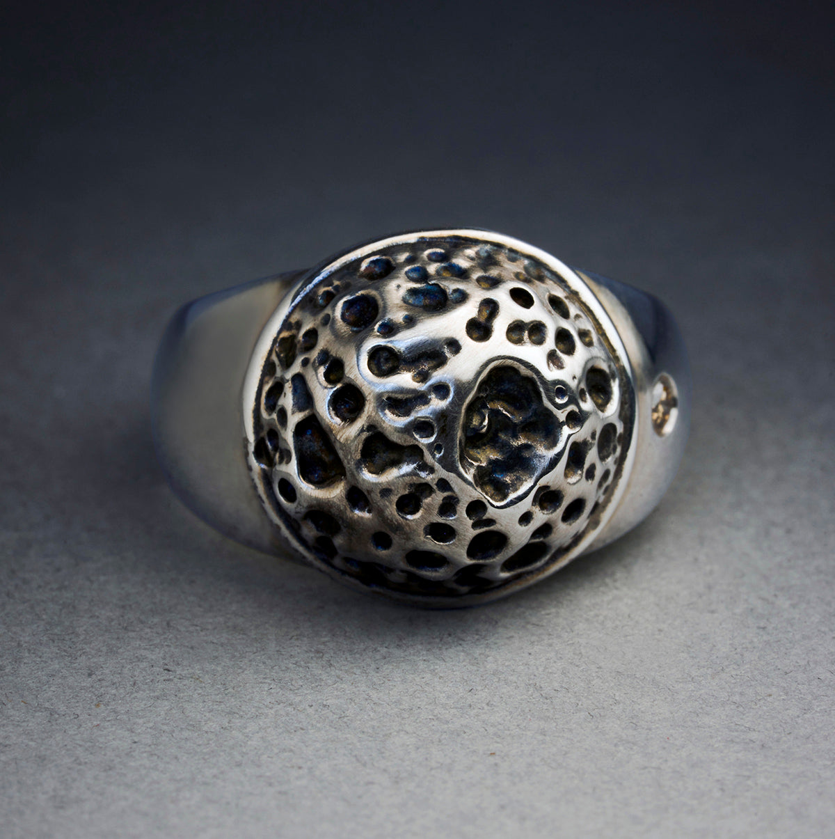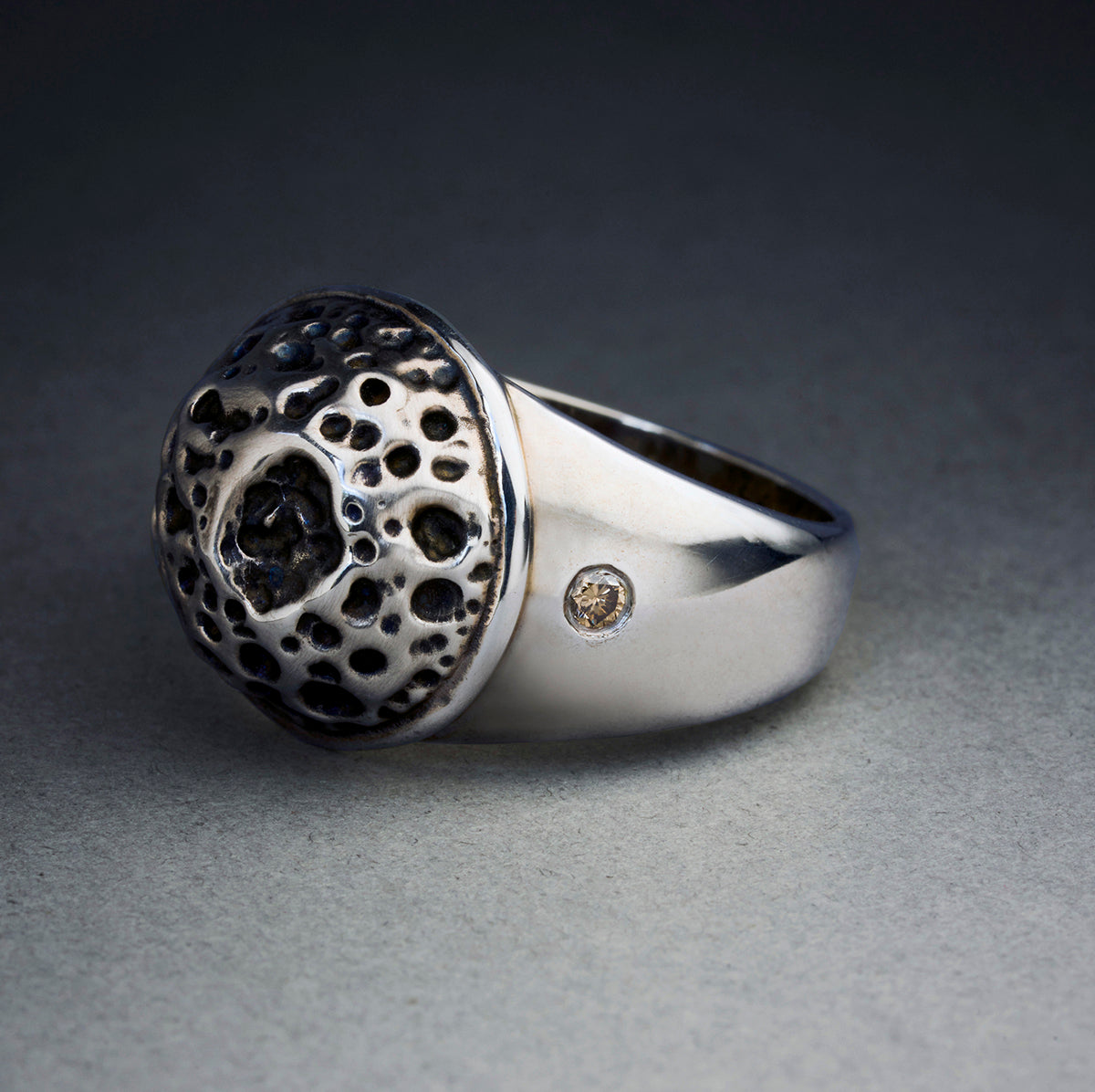 Highly detailed face of the moon ring adorned on one side with a single cognac diamond.