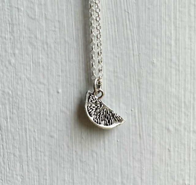 Tiny incredibly detailed 15x13mm sterling silver orange hanging from a sterling silver chain.