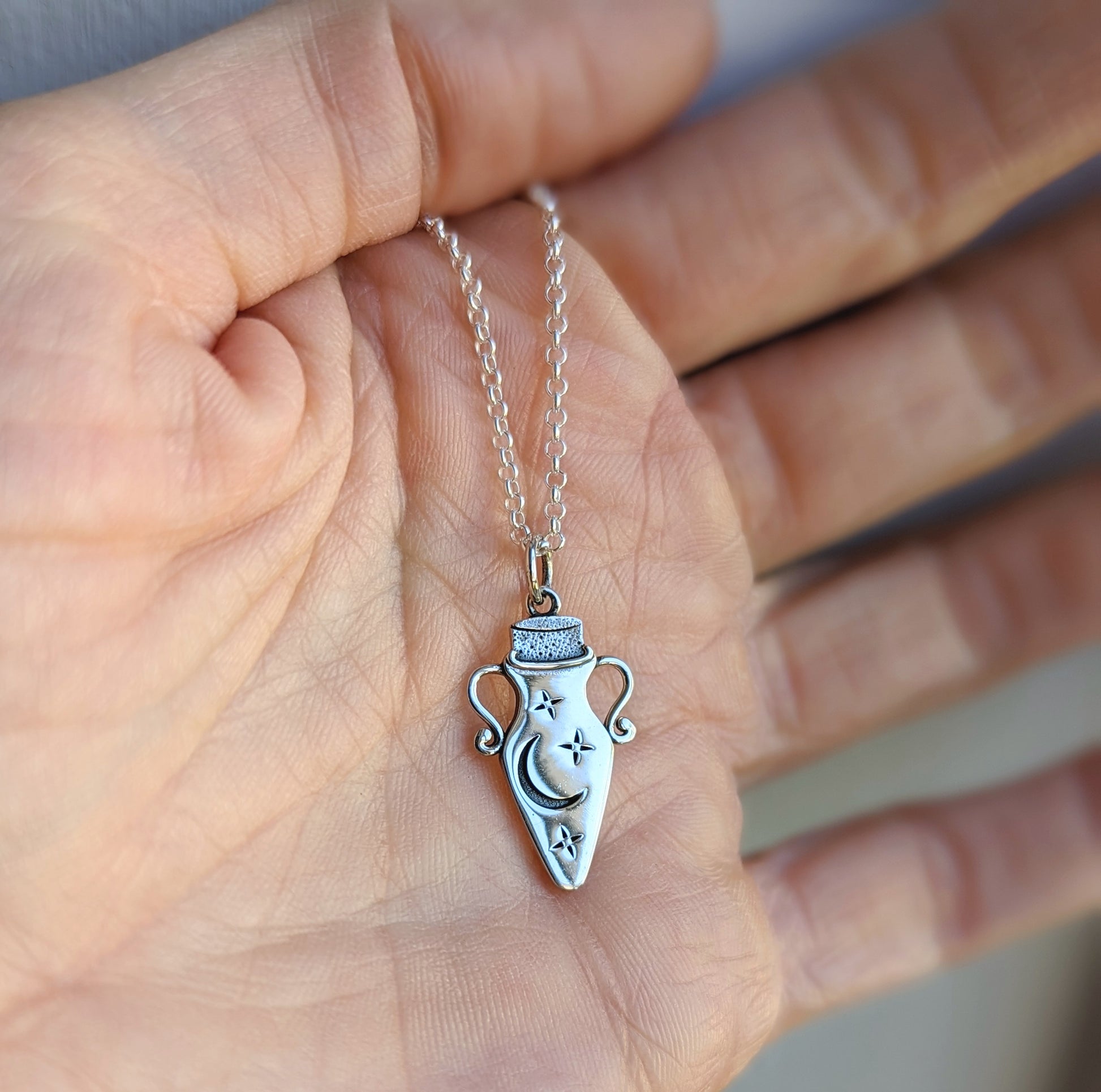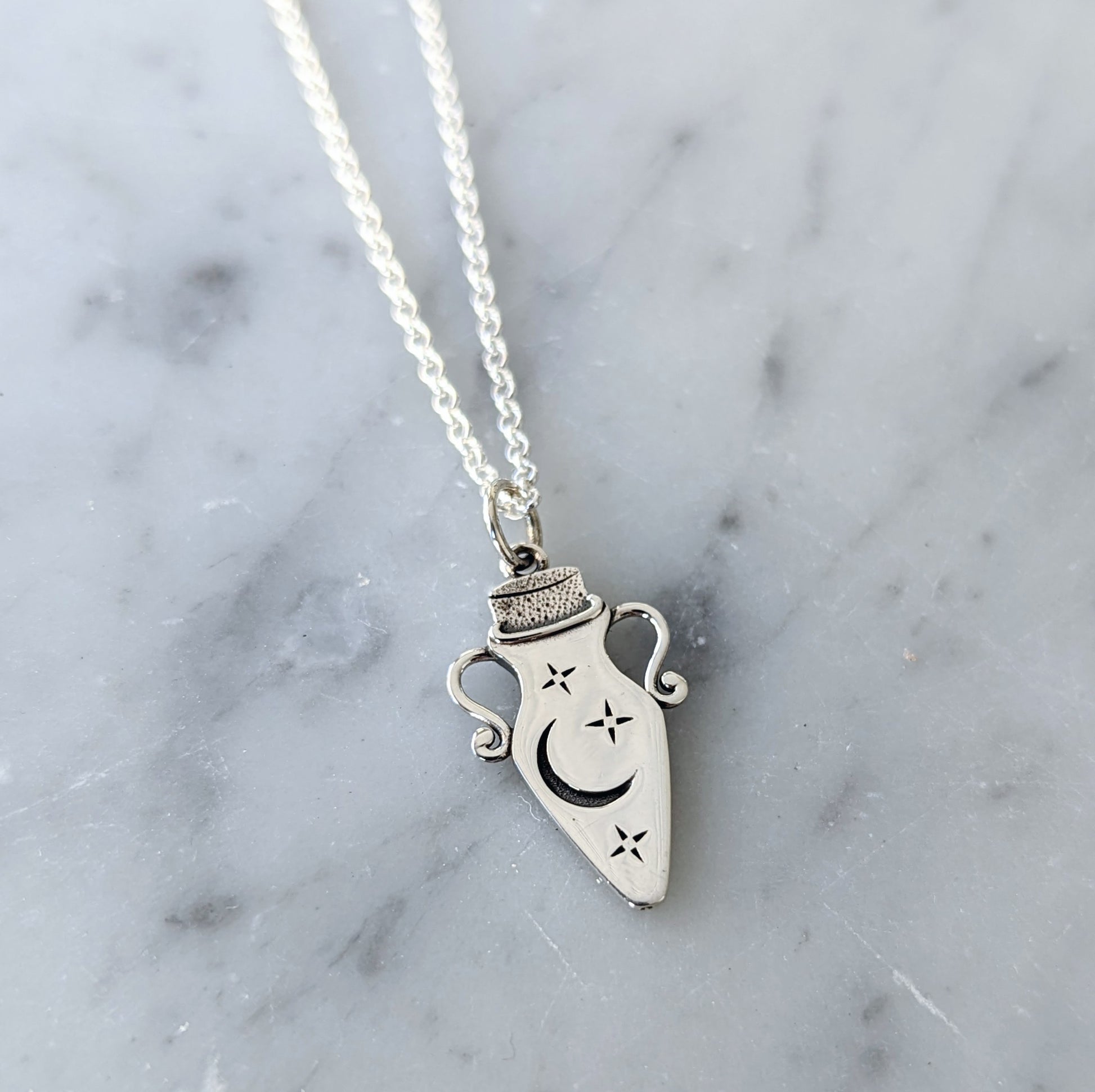 Sterling silver enchanting potion bottle charm hanging from a sterling silver chain.