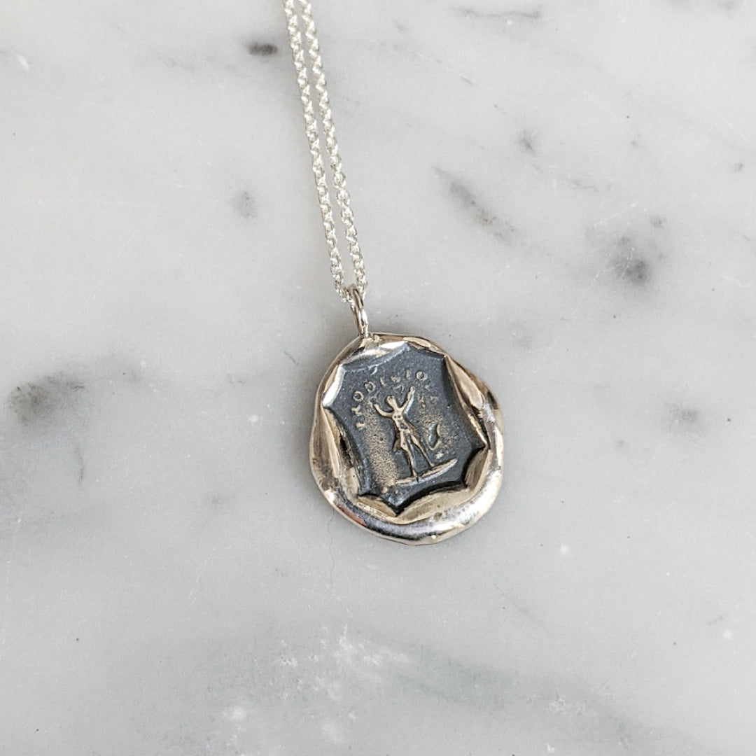 This 1/2" tall sterling silver charm is made from an antique wax seal that was hand carved in the 1800's. This charm features a maestro with the word "Prodigious" above and hangs from a sterling silver chain.