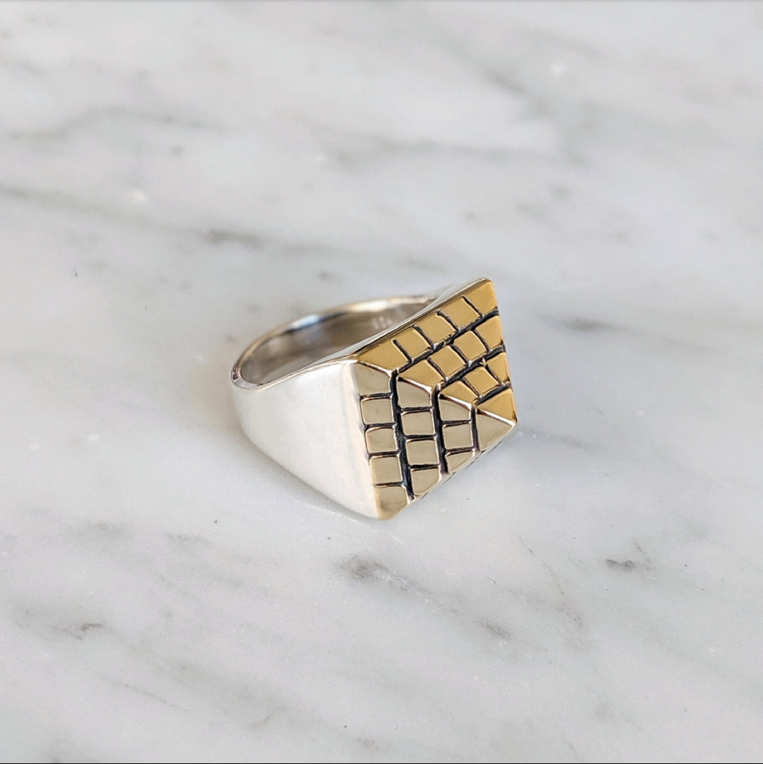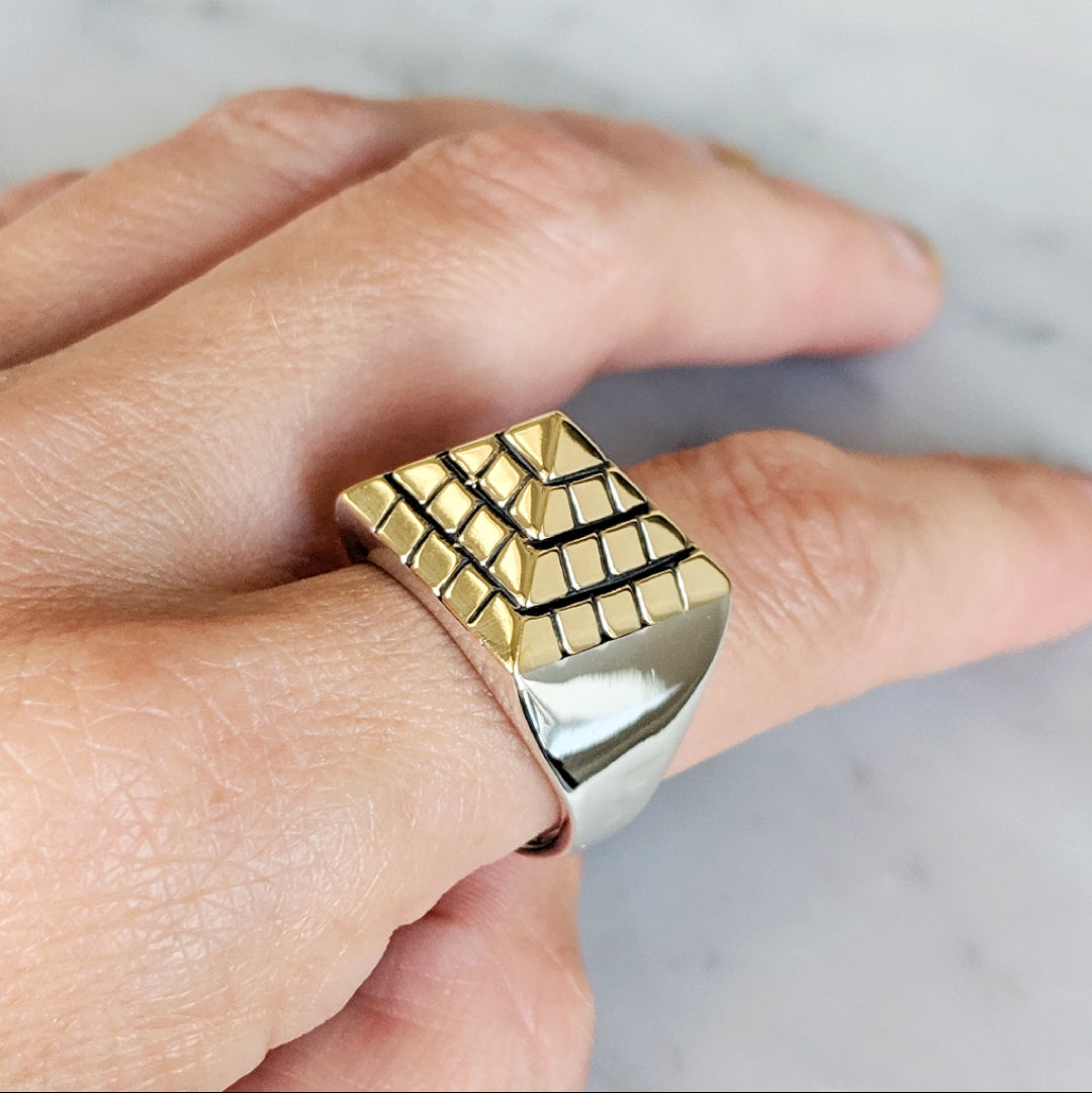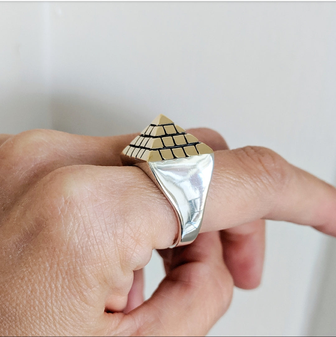 Beautifully hand carved Leviticus pyramid ring. The pyramid on this ring is cast in brass and the band is cast in sterling silver.