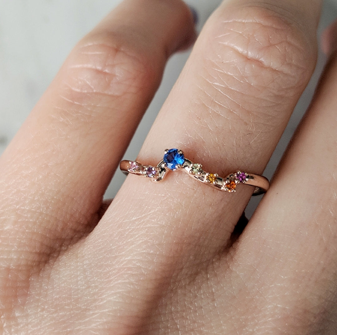 This gorgeous sparkly rose gold band is adorned with 1.25mm wide pink tourmaline, amethyst, peridot, yellow sapphire, citrine, and ruby and a 2.5mm wide blue sapphire.