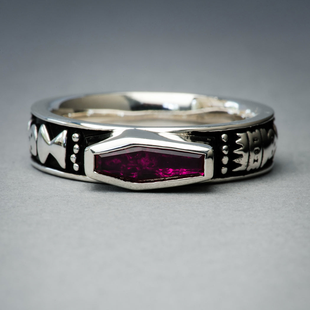 925 sterling silver ring band with extremely detailed band featuring two full skeletons, with a crown atop one's head signifying that "death is the ruler of all." Atop the other skeleton's head there is an hourglass, representing the fact that time is passing. All details on the ring are reserved on black enamel that encircles the outer ring loops. The focal point of this ring is the skeleton carved out of sterling silver that in encapsulated by a pristine faceted casket shaped crystal.