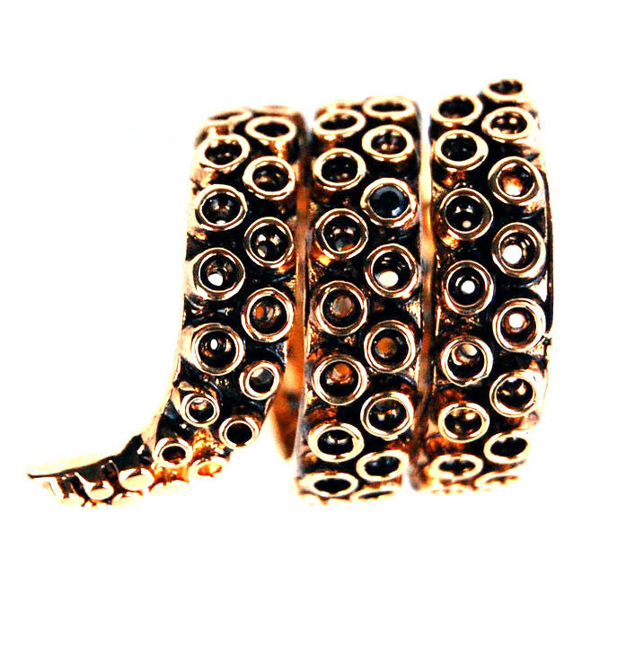Rhodium, silver, or gold plated brass cast squid tentacle wrap ring.