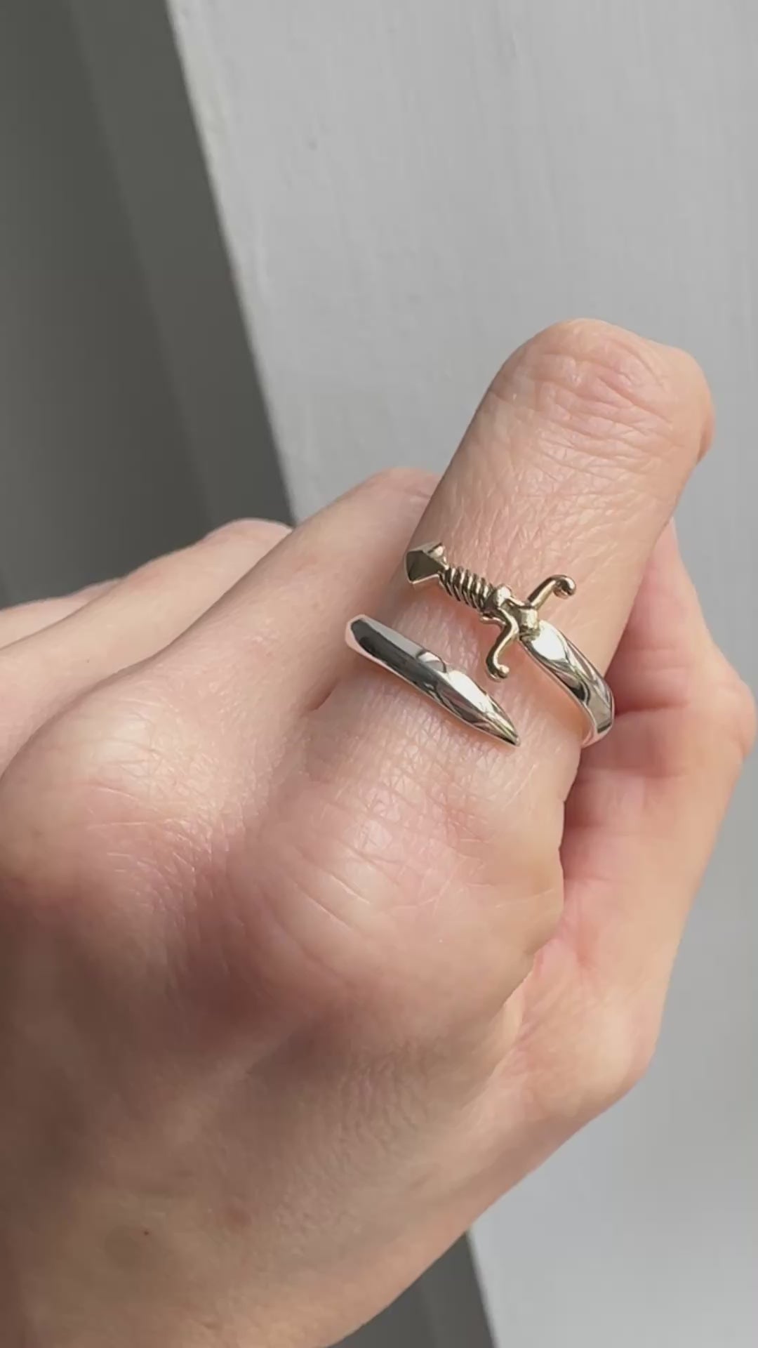 A beautiful sword wrap ring cast in sterling silver with a bronze handle. This ring is adjustable.