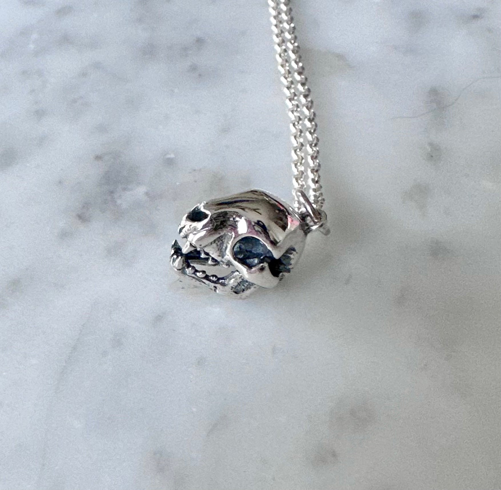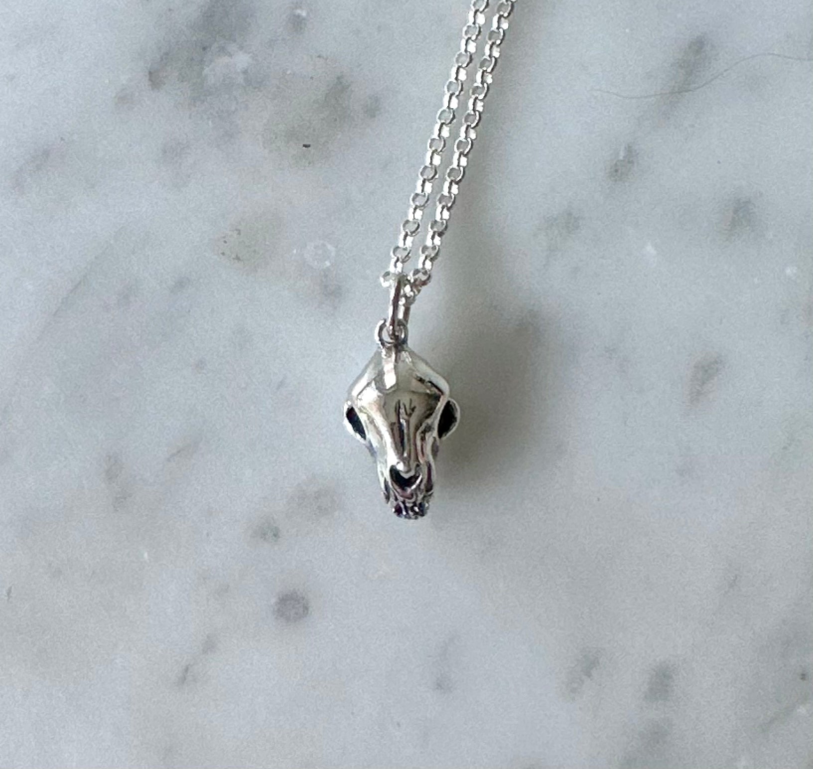18mm Sterling silver cat skull charm hanging from a sterling silver chain.