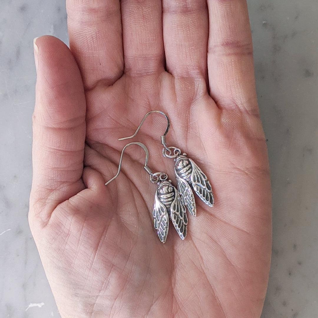Highly detailed sterling silver cicadas hanging from sterling silver ear wires.